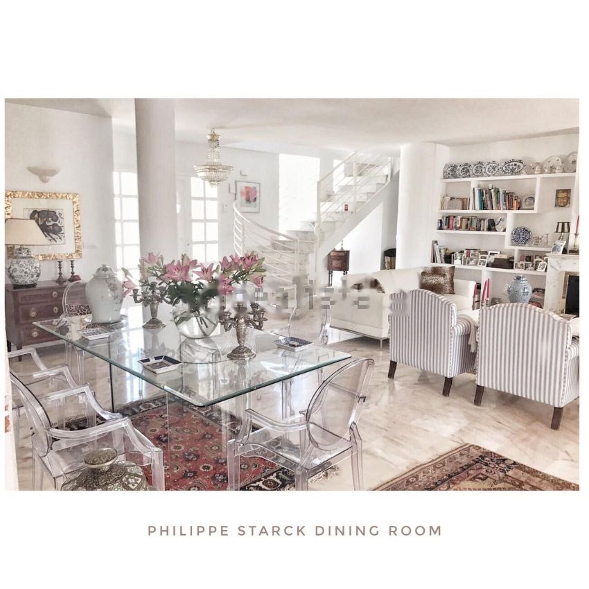 La casa tiene cuatro dormitorios, tres de ellos en el primer piso (uno de ellos es un apartamento Loft de 56 mts. cuadrados) y uno en la planta baja más tres baňos con WC y un servicio separado en la zona de la entrada para huéspedes. El apartamento Loft - en parte con una altura de más de 4 mts. – está planeado como “casa en la casa” incluyendo un baňo y abre por una torre circular en vidrio azul, que contiene una escalera de caracol, la panorama-plataforma en el segundo piso. La sala de estar en la planta baja con chimenea interior y con comedor integrado (50 mts. cuadrados) asi como vista dominante a la terraza y al jardin está unida con la cocina – con un espacio de 16 mts. cuadrados para lavar y planchar – con un paso abierto. Desde alli se llega al garaje interno.