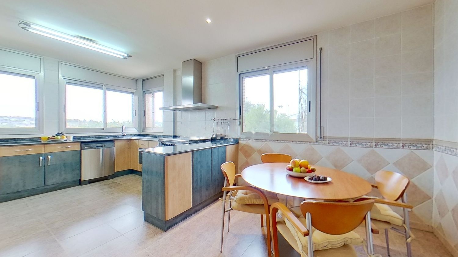 A la izquierda nos encontramos con una espaciosa y completa cocina, muy luminosa, con amplios ventanales, con persianas automatizadas y bonitas vistas. La cocina está equipada con una gran habitación despensa.