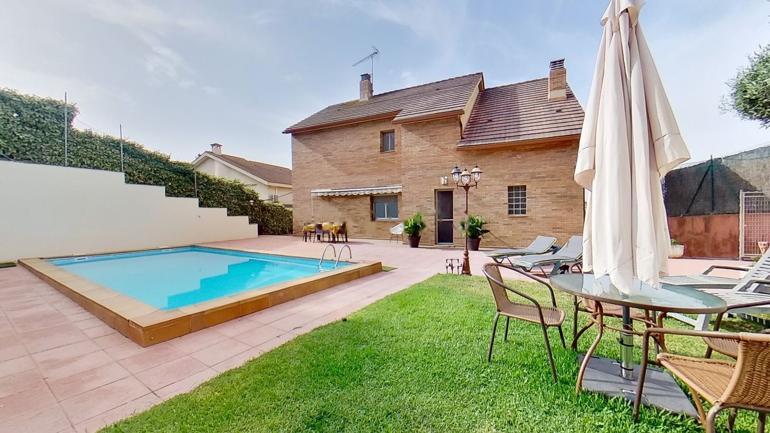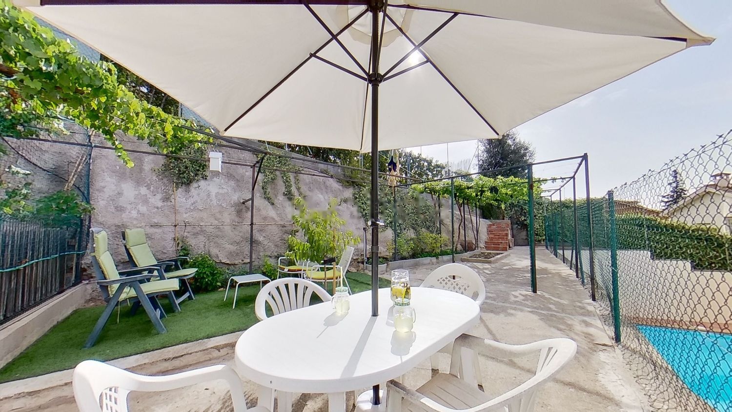 Dispone de una amplia piscina, zona de jardín, barbacoa, caseta de obra y pérgola biodinámica, situada en la parte trasera de la casa, con privacidad en el ambiente.