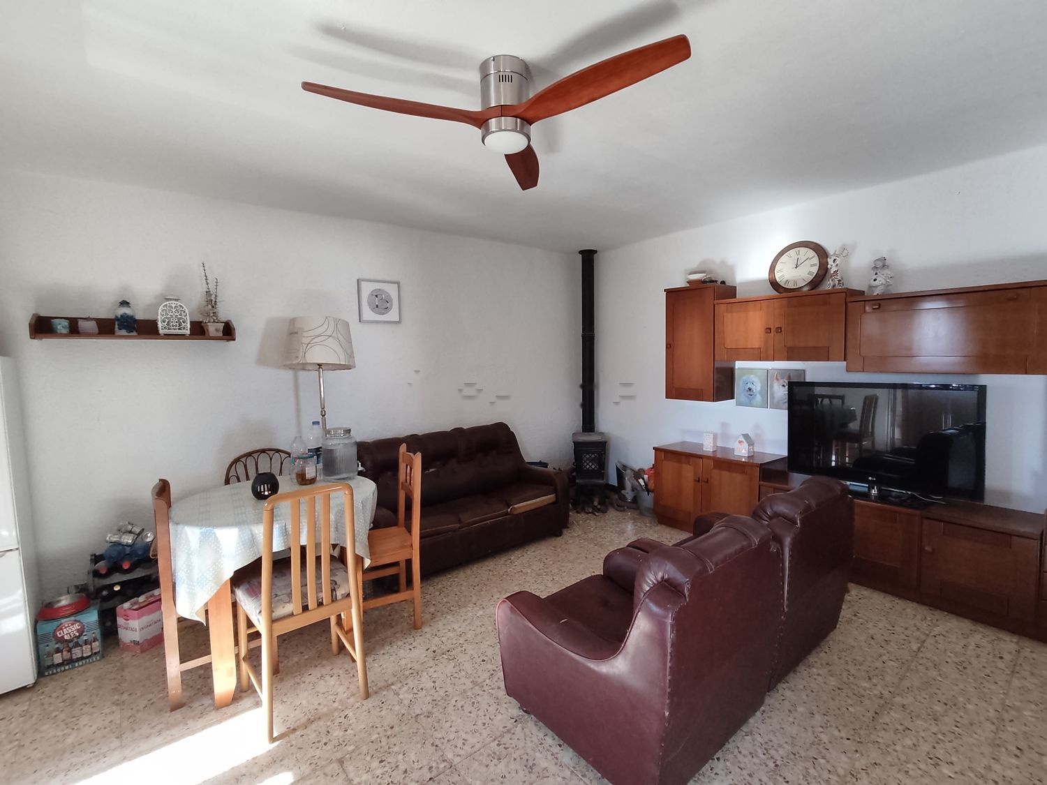 Salón con estufa de leña que calienta toda la casa.
