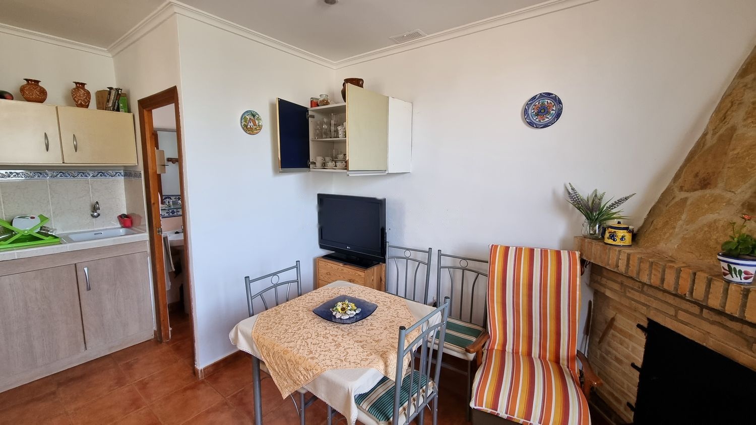 - Salon con chimenea de leña regulable con aire. Consta de mesa, sillas, sofá, cajoneras y armarios. Televisión y mecedora.