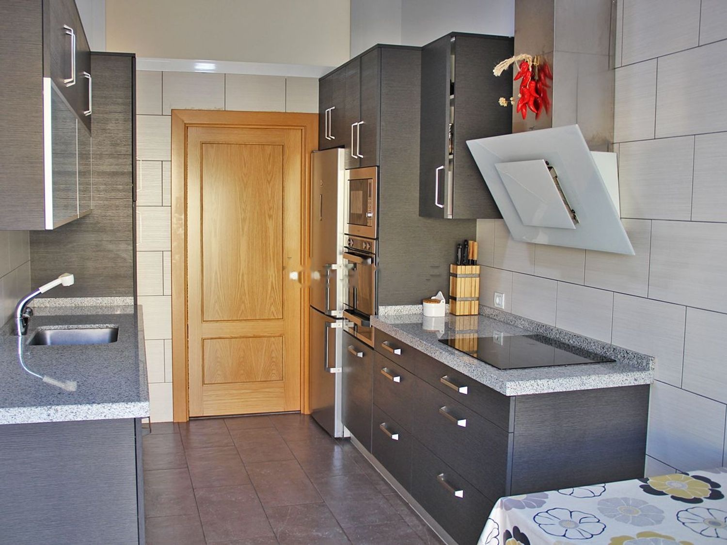Cuenta con cocina equipada (horno, microondas, placa de inducción, campana…etc), calefacción de gasoil (depósito en garaje) y placa térmica solar para el agua caliente. Este sistema surte de agua caliente a la casa sin tener encendida la caldera unos 5-6 meses al año.