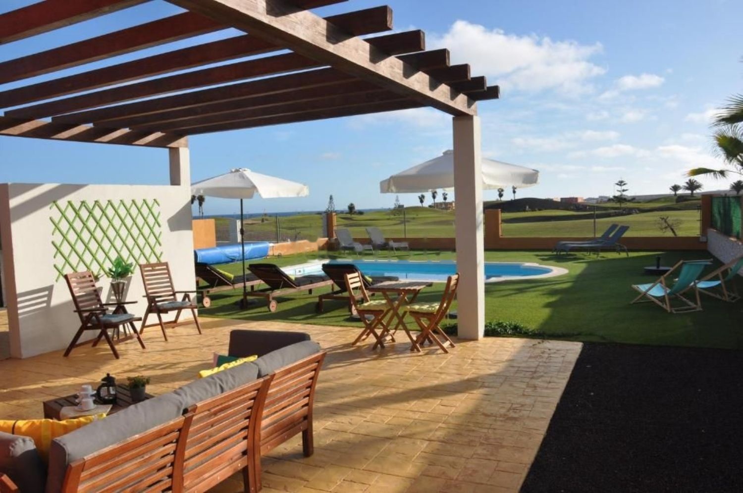 Magnífica villa, con 5 habitaciones, 3 baños (1 de ellas con Jacuzzi), un salón que conecta con el patio, piscina climatizada, amplia cocina y preparada para entrar a vivir. Ideal para familias grandes y junto al campo de Golf de Caleta de Fuste.