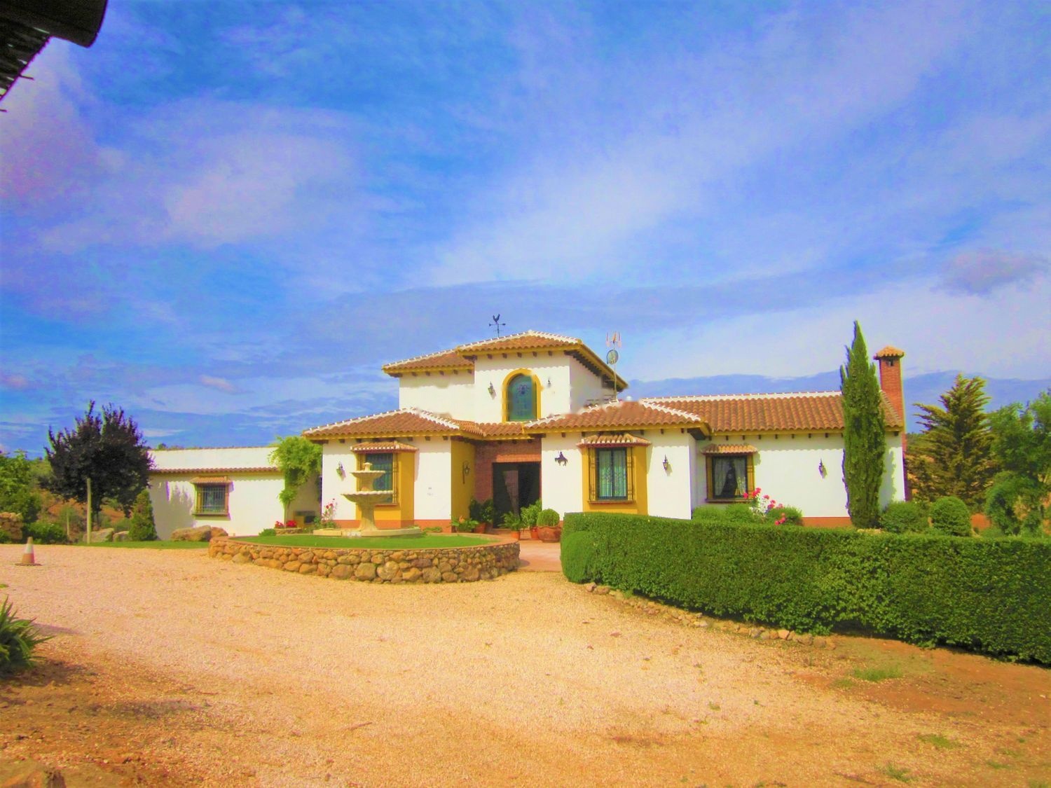 Jardines; 3 fuentes de decoración, piscina, 2 pozos de agua propia un aljibe de 100.000 litros agua propia, y un aljibe de 25.000 litros agua municipal, aparcamiento cubierto para 4 vehículos, huerto cercado con frutales de 800m2 y zonas habilitadas para gallinas, pavos y patos.
