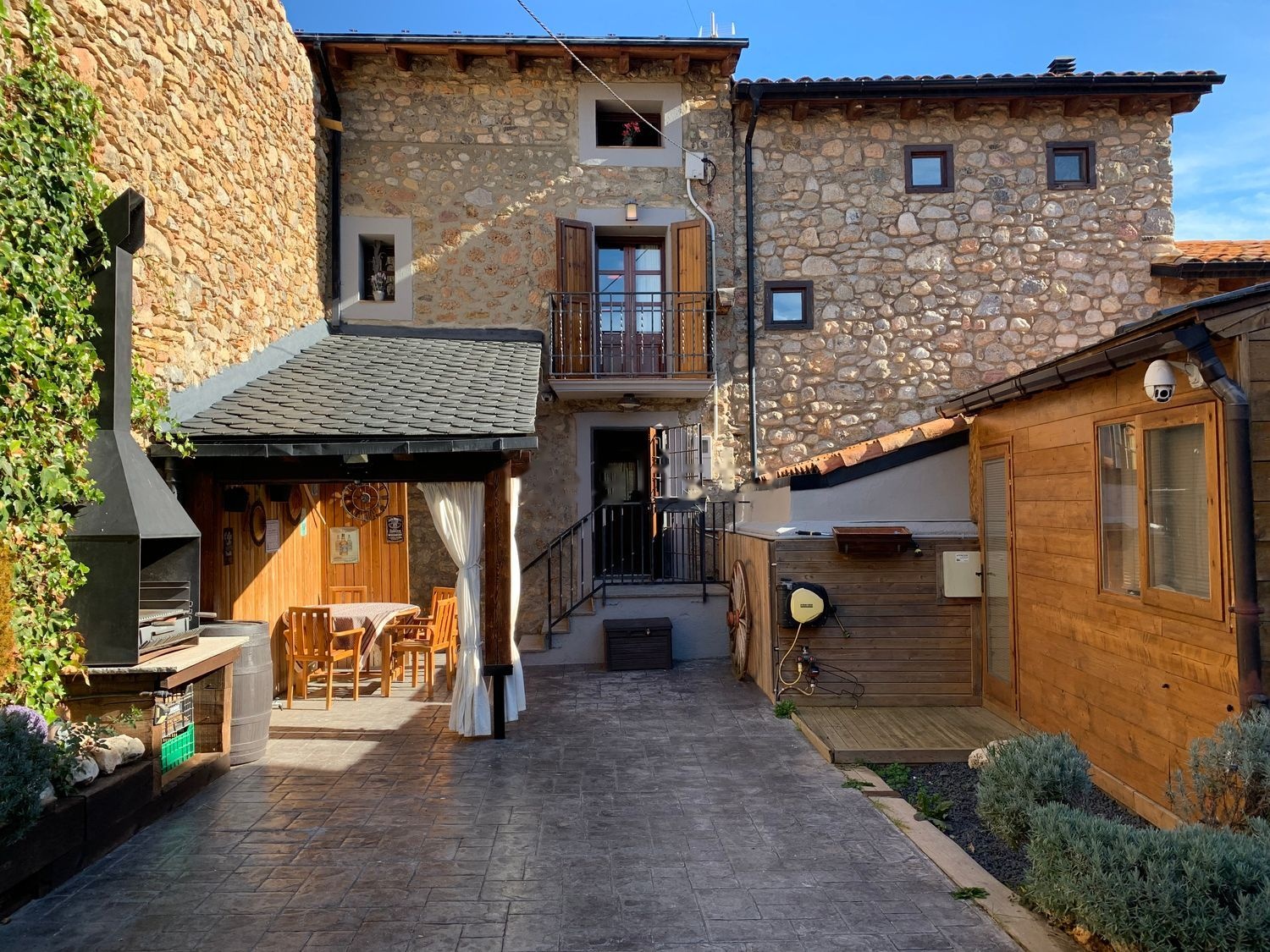 Entramos por un amplio patio con porche donde podemos encontrar una zona ajardinada, barbacoa y la zona de spa con una bañera hidromasaje para ocho personas y una caseta de herramientas.