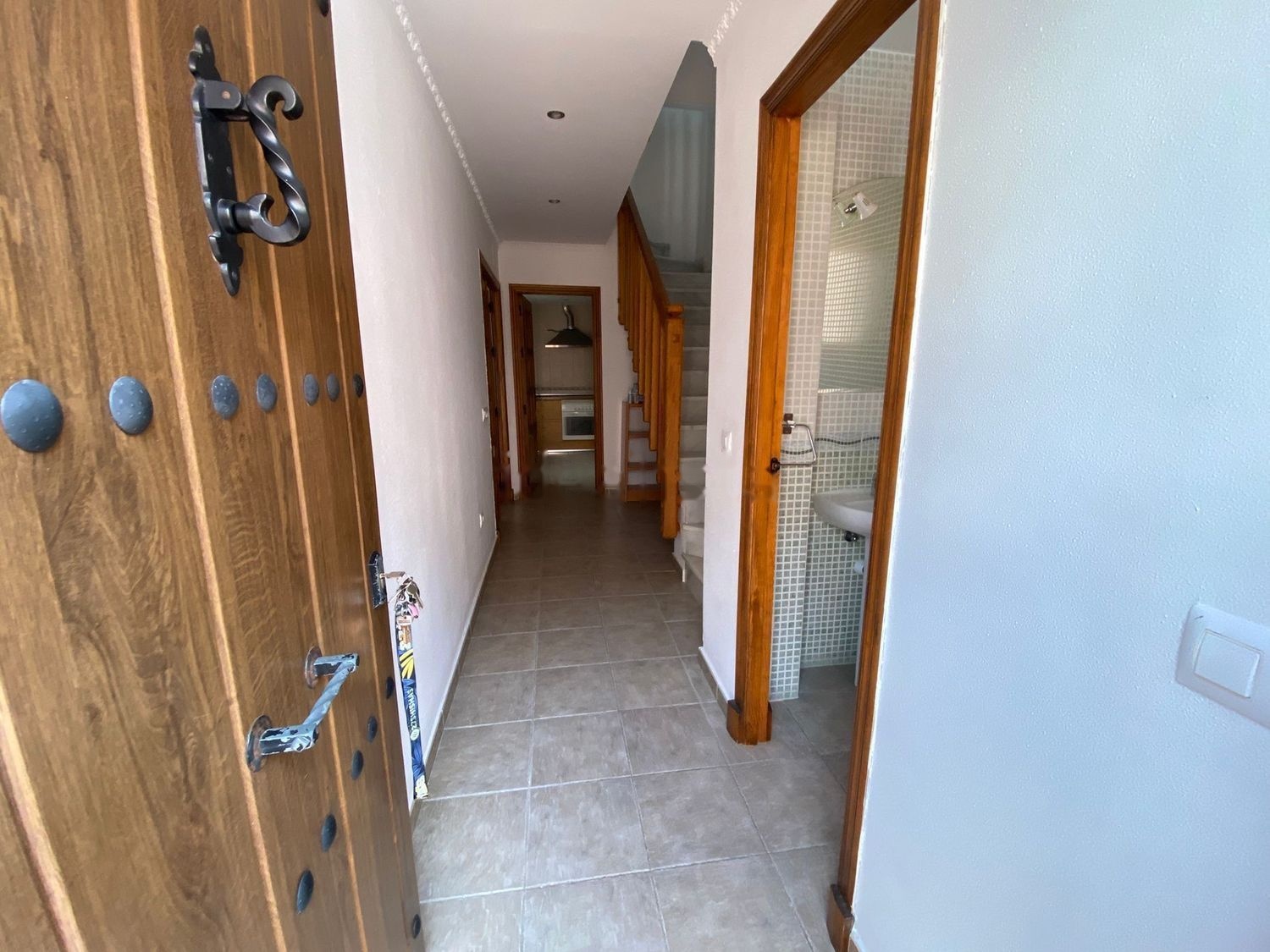 VestÃbulo, salón/comedor, cocina amplia, aseo, escaleras y patio de 10 metros cuadrados techado, en planta baja y distribuidor, tres dormitorios y cuarto de baño con bañera en planta alta.