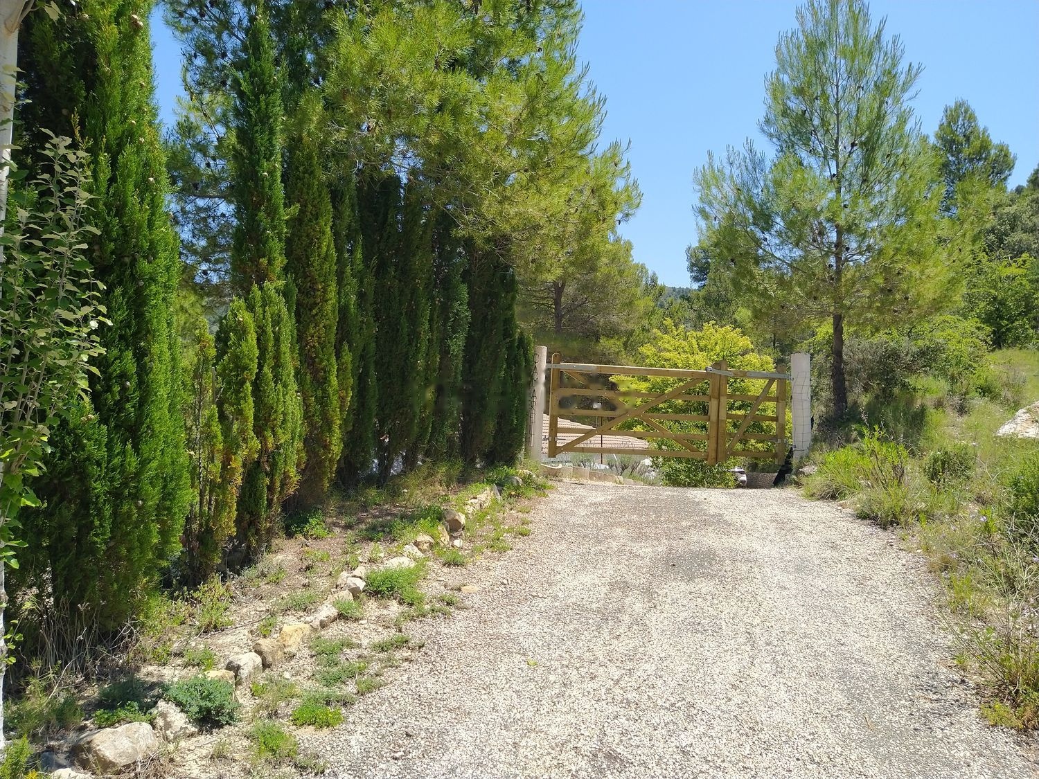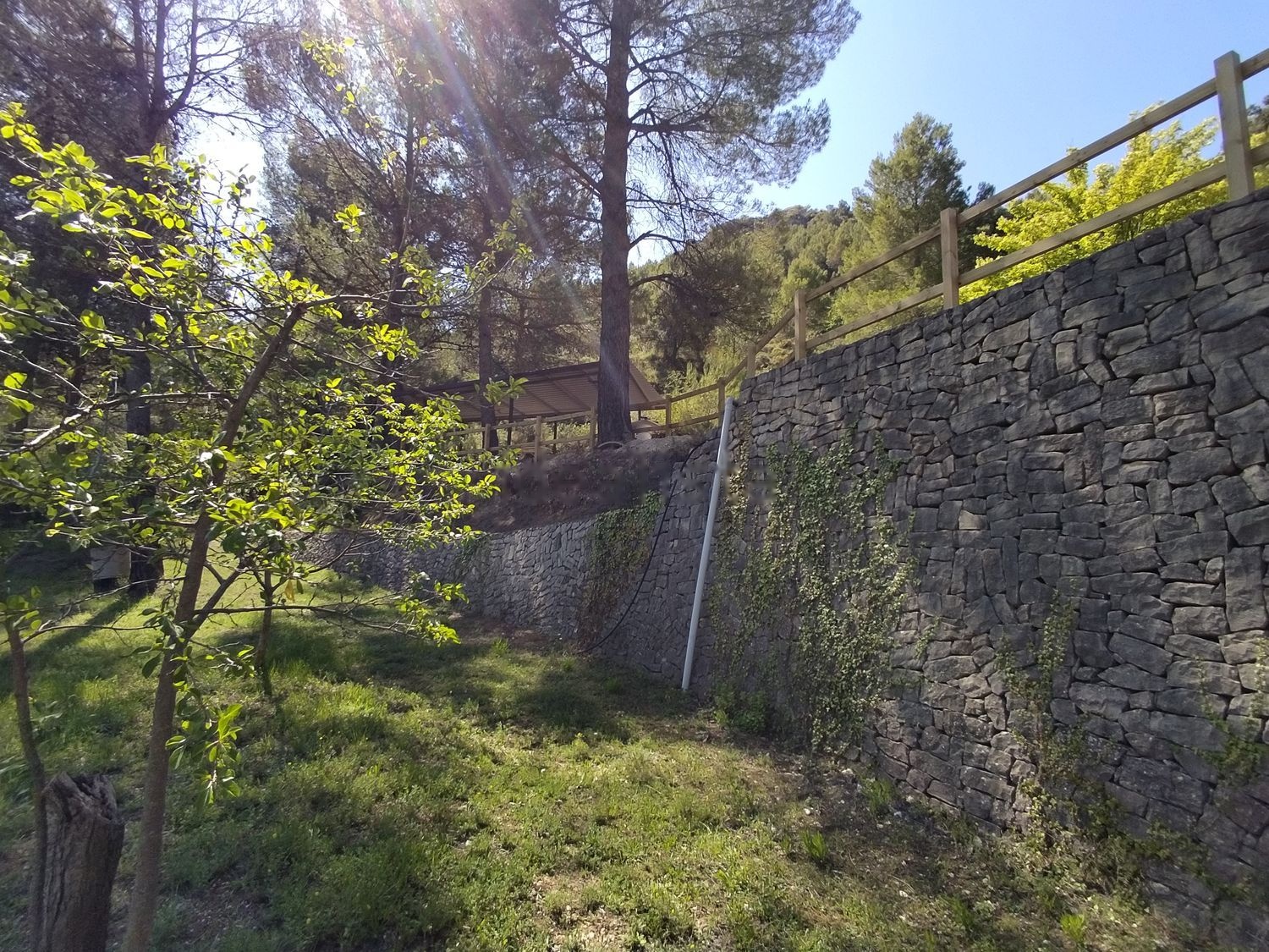 Dispone de varios bancales con árboles frutales (higuera, peral, almendro, varios olivos, etc) y una gran pinada.