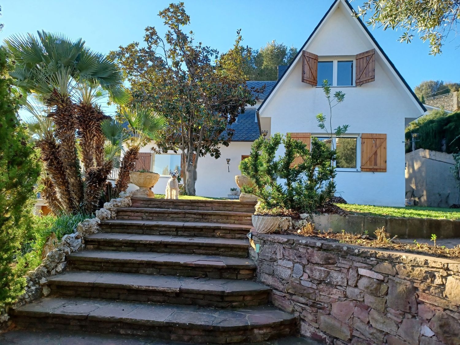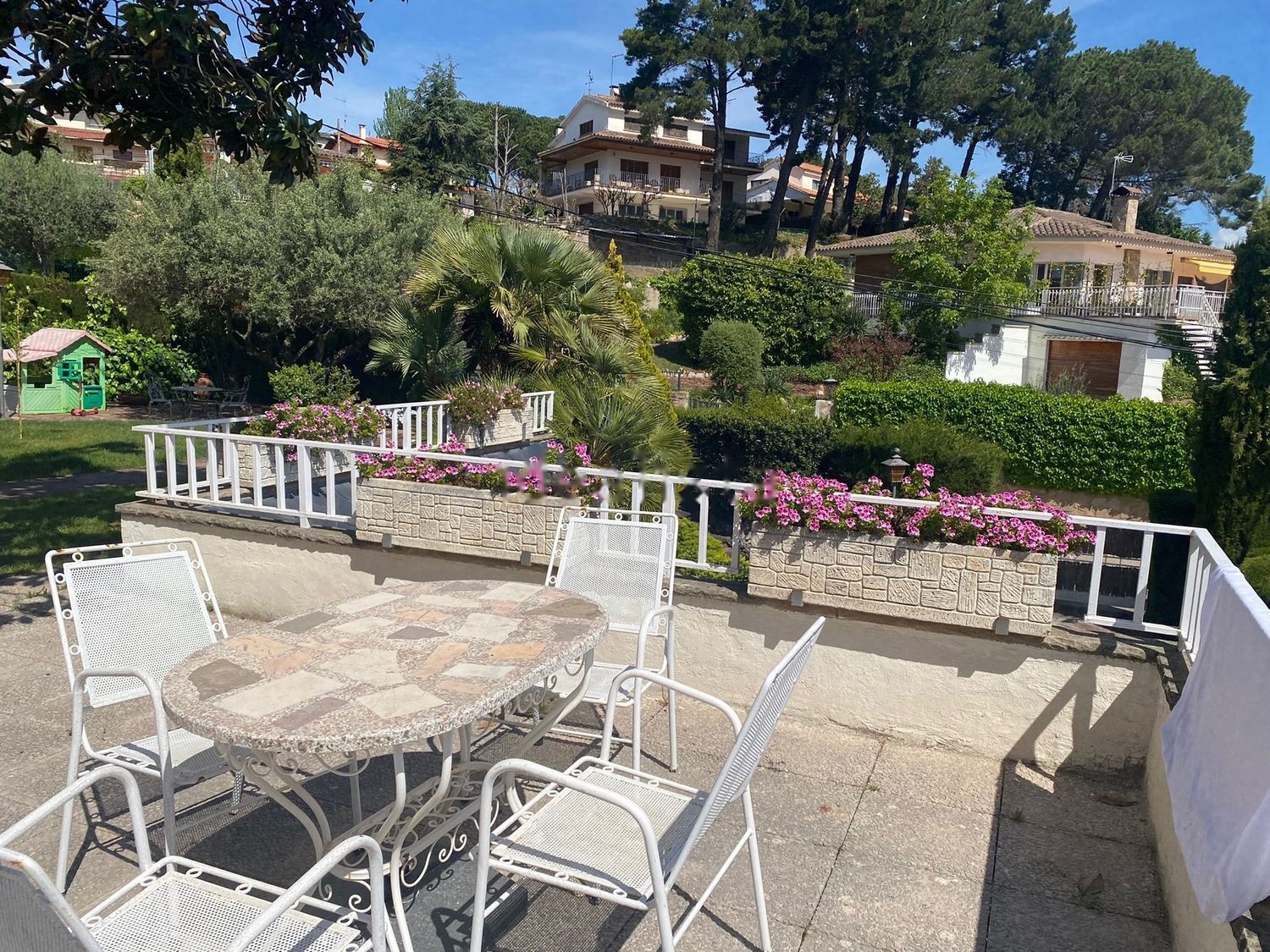 El jardín tiene árboles de la zona, olivos, pinos, frutales. Con varios desniveles, todo el jardín tiene vista.