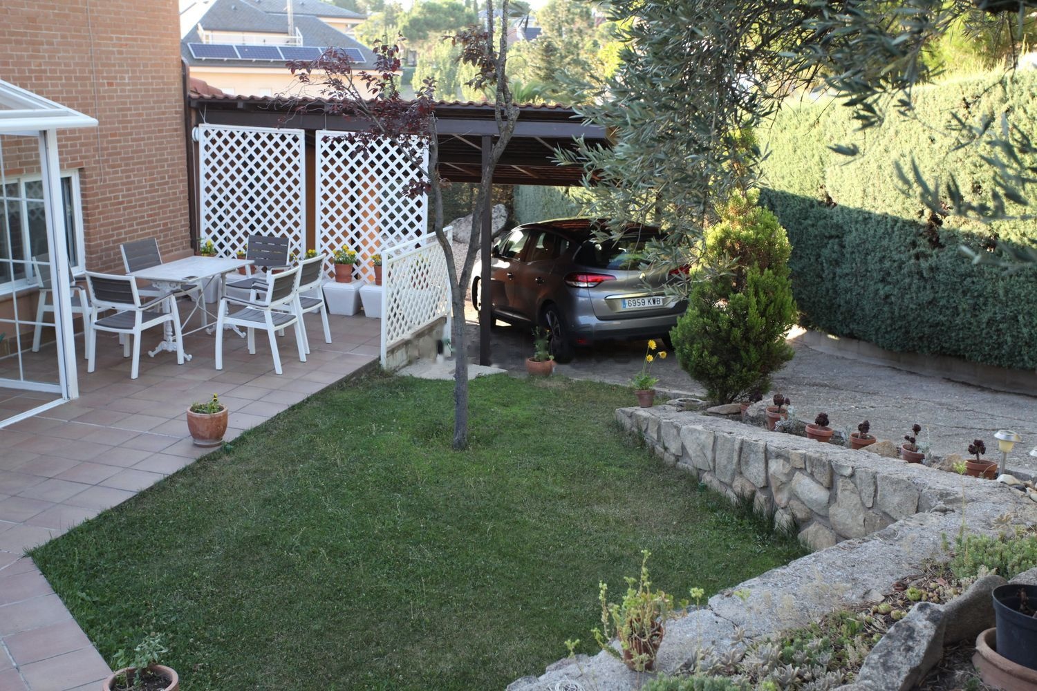 El jardín diseñado con respeto hacia el medio ambiente resulta un espacio atractivo y fácil de mantener. Con una pequeña zona de césped; un espacio con grava y grandes rocas que dan sensación de un jardín japonés; zona con plantas autóctonas y zona de huerta. Hay instalación de riego automático.