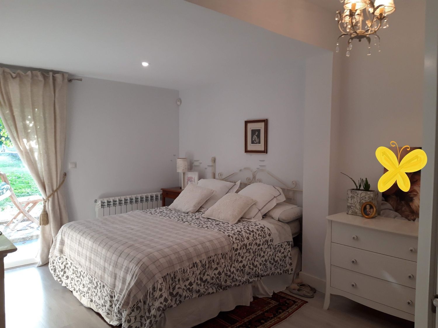 La casa dispone de tres habitaciones, y 2 cuartos de baño. La principal consta de un gran vestidor y baño incorporado y con un gran ventanal de acceso al jardín. El segundo baño consta de 2 senos, bañera y ducha italiana.