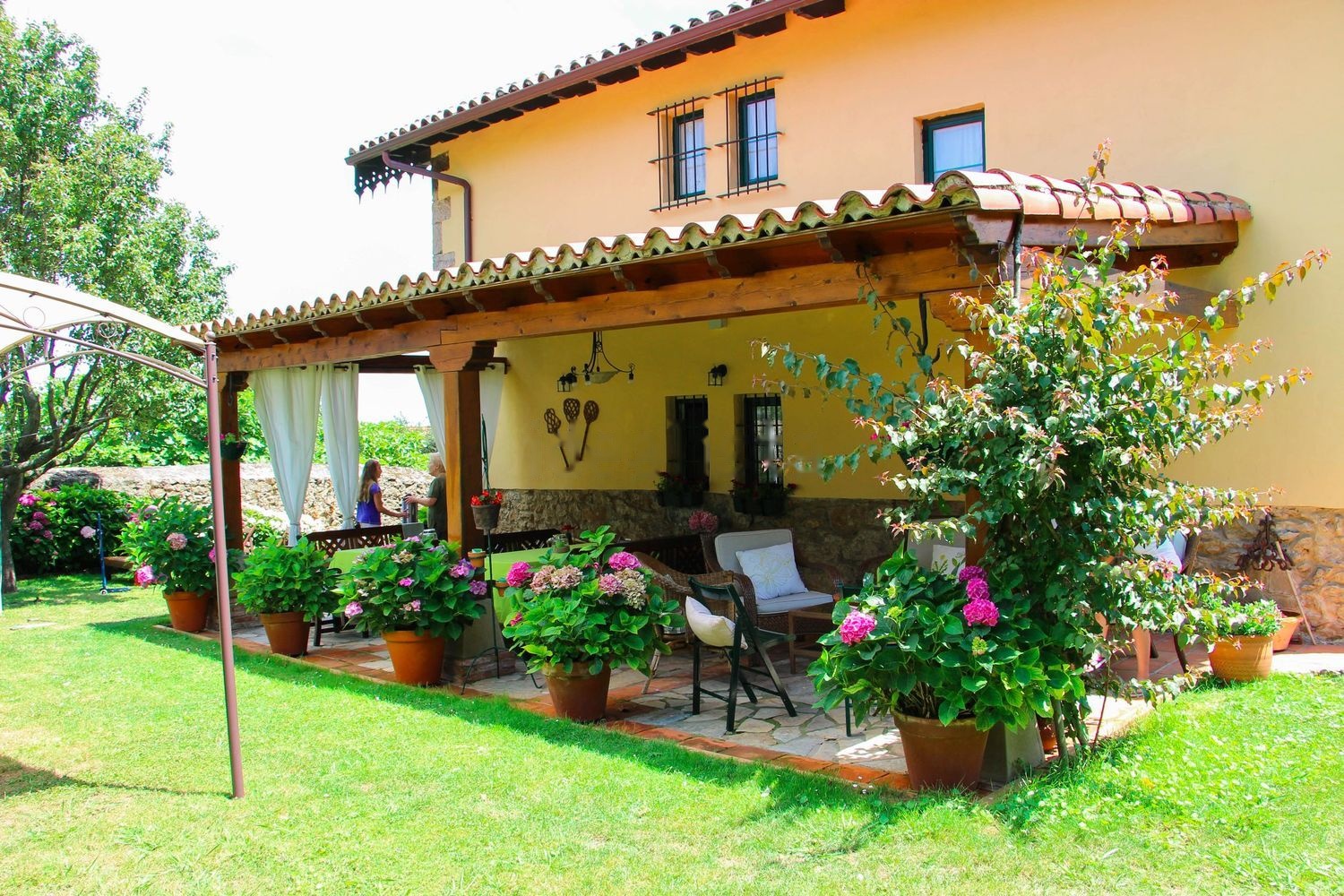La zona exterior cuenta con agradable porche de 30 m2, un amplio jardín con árboles variados como limoneros, robles, nogales y laureles.