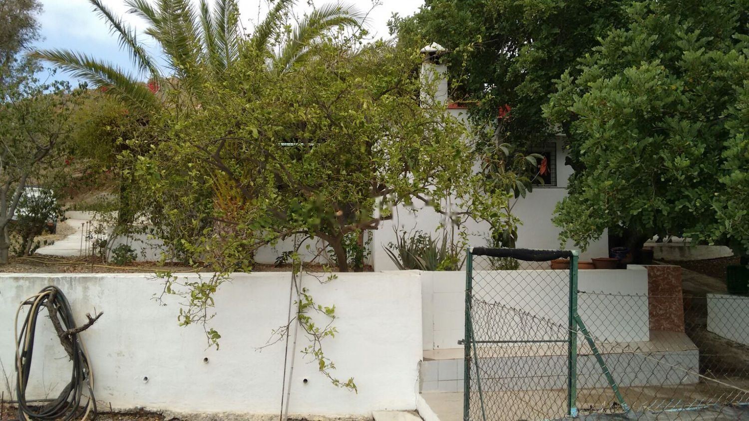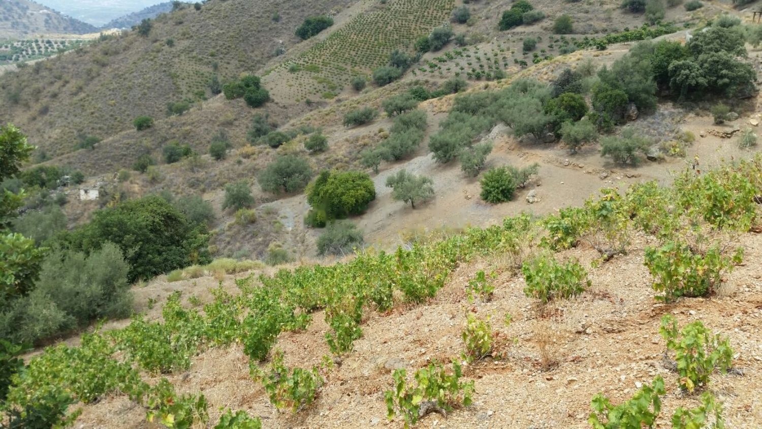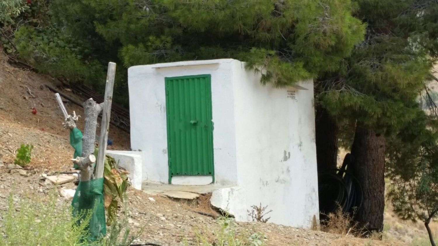 El terreno esta constituido por zona de secano y otra zona de bancales de arboles frutales como aguacates, niperos, peras, chirimoyas, etc etc, posee un pozo subterraneo con motor sumergible y una alberca para el riego, tambien hay un pozo abajo en el rio con otra bomba para subir agua a la alberca, posee almacen para herramientas, aljibe para la vivienda y una caseta donde se encuentra la abonadora para regar con goteo con programador.