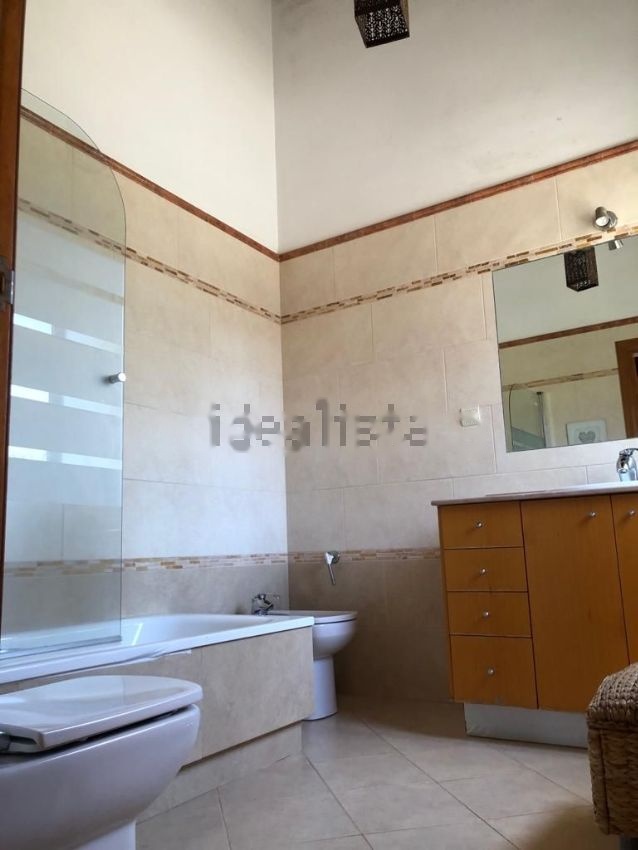 Parte de abajo compuesta por garaje grande incorporado en la casa, aseo con ducha, amplia cocina, salón comedor de 40 metros cuadrados con chimenea y salida a terraza y jardín, los suelos de gres y escalera a planta superior de mármol, la planta de arriba con suelos de parquet donde hay cuatro habitaciones, todas ellas dobles con techos altos de madera, la habitación principal muy grande en suite con baño con bañera y gran terraza, en el espacio de distribución de las habitaciones hay un tercer baño completo con ducha. La casa está en un terreno de 415 metros compuesto de terraza, jardín y piscina.