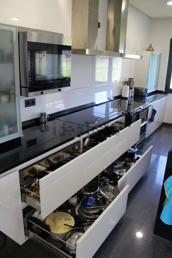 A través de la cocina se accede tanto al enorme garaje (para dos coches grandes), como a la sala de calderas y a un gran almacén.