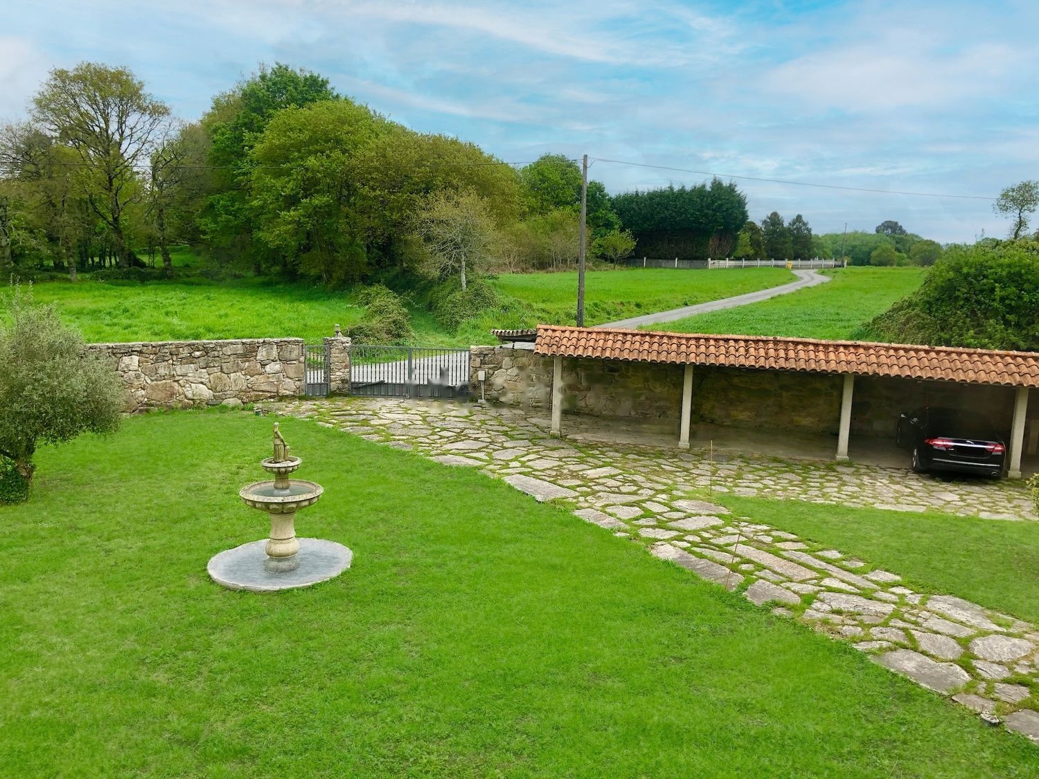 La finca se distribuye en una zona ajardinada de 6700 m2 completamente cercada y una zona rústica de 4000 m2. El jardín cuenta con hórreo, fuente y piscina sin terminar. La propiedad disfruta de mucha privacidad, más de 100 metros del cerco perimetral cubierto por tuyas.