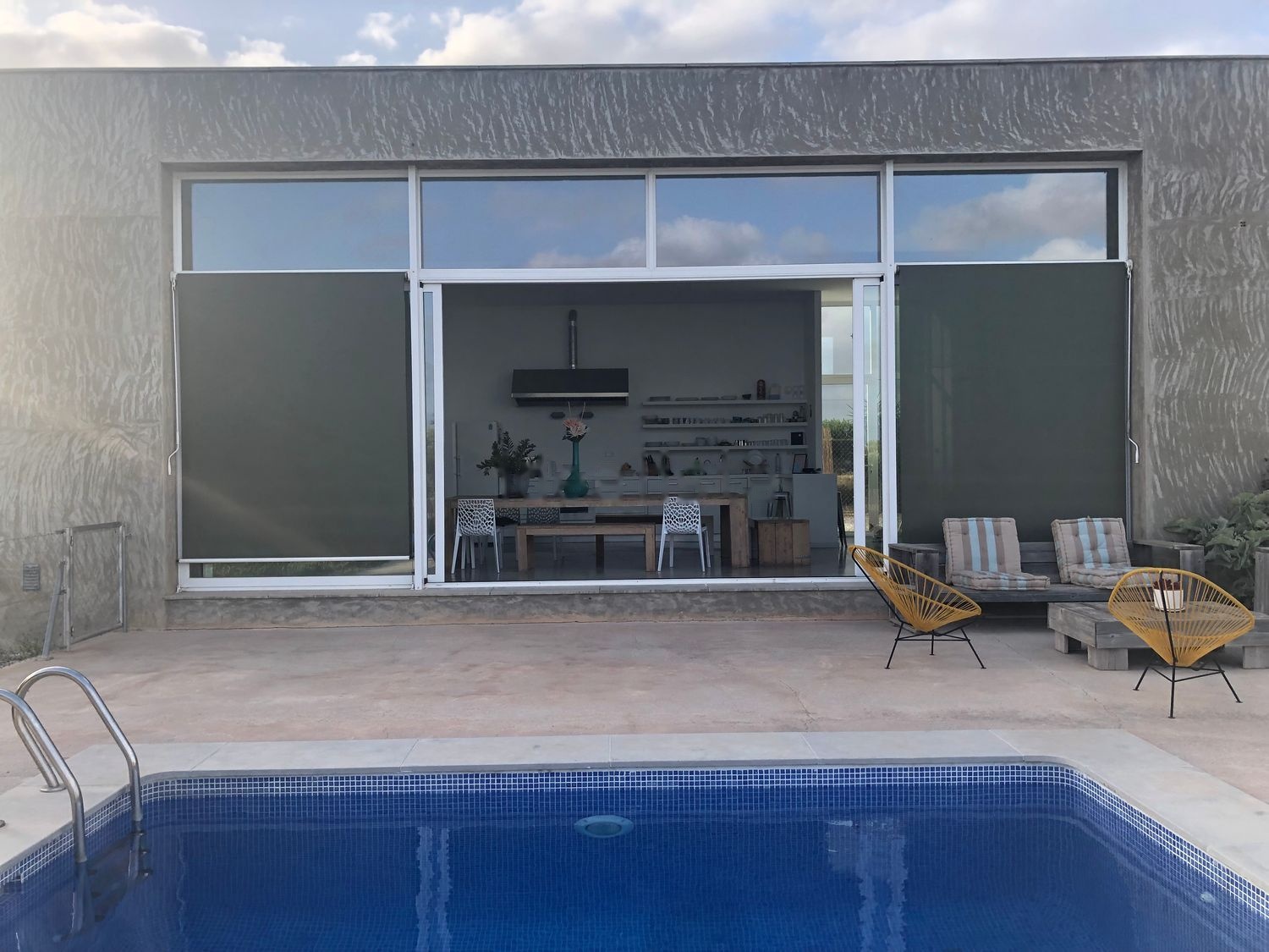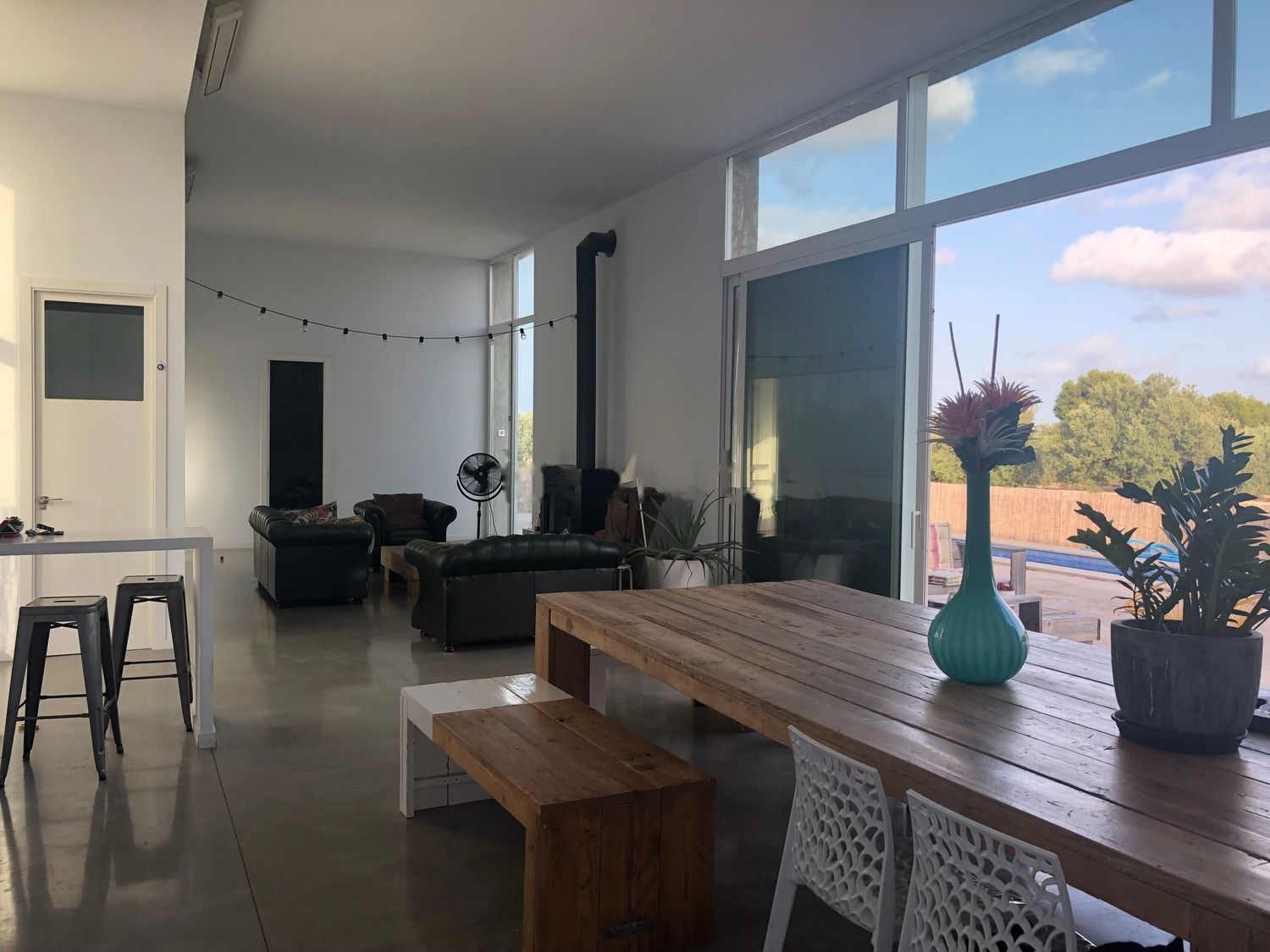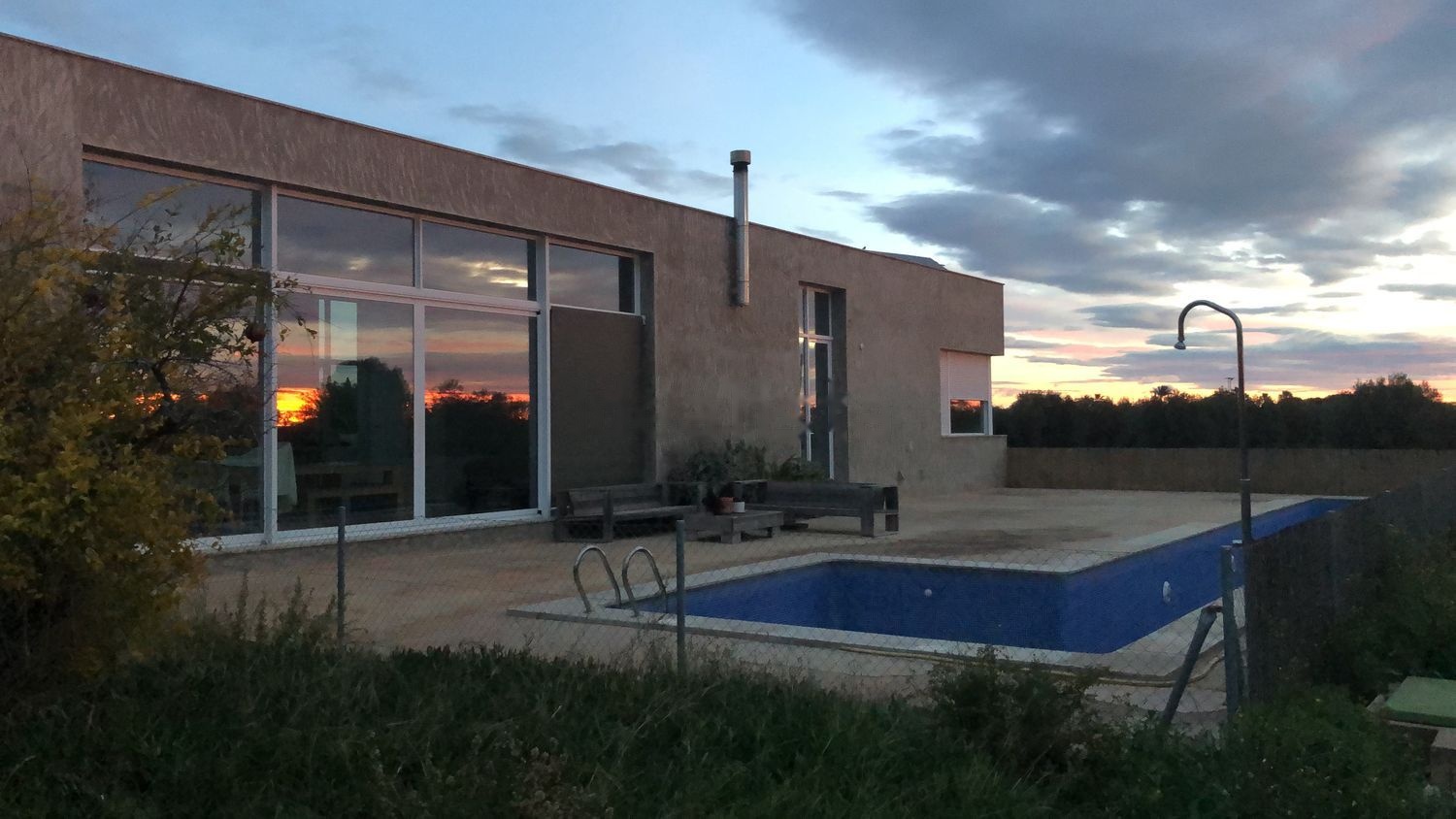 Terreno de 11.375m2, con una vivienda unifamiliar, que cuenta con dos suites y un espacio central abierto común tipo loft que incluye cocina, lavabo de cortesía, sala de estar y comedor abierto a una pared de vidrio practicable que abre a la piscina, chimenea de grandes dimensiones metálica de diseño que sirve para calentar la casa durante los meses de invierno. Techos de 4m de alto en toda la edificación. Ideal para personas de gran estatura, o que disfruten de espacios interiores amplios, iluminados de forma natural.