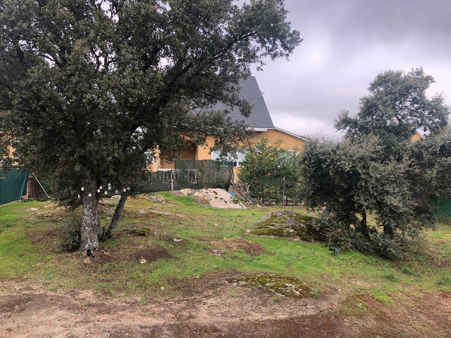 La casa se encuentra en mitad de La parcela, de prácticamente 800m2, que cuenta con cuenta con dos encinas y rocas naturales. Se puede acceder a ella desde la entrada o desde el precioso porche que se comunica con el salón, donde se puede desayunar, comer o cenar con la sensación de estar en plena naturaleza. Cuenta con barbacoa de obra en el jardín