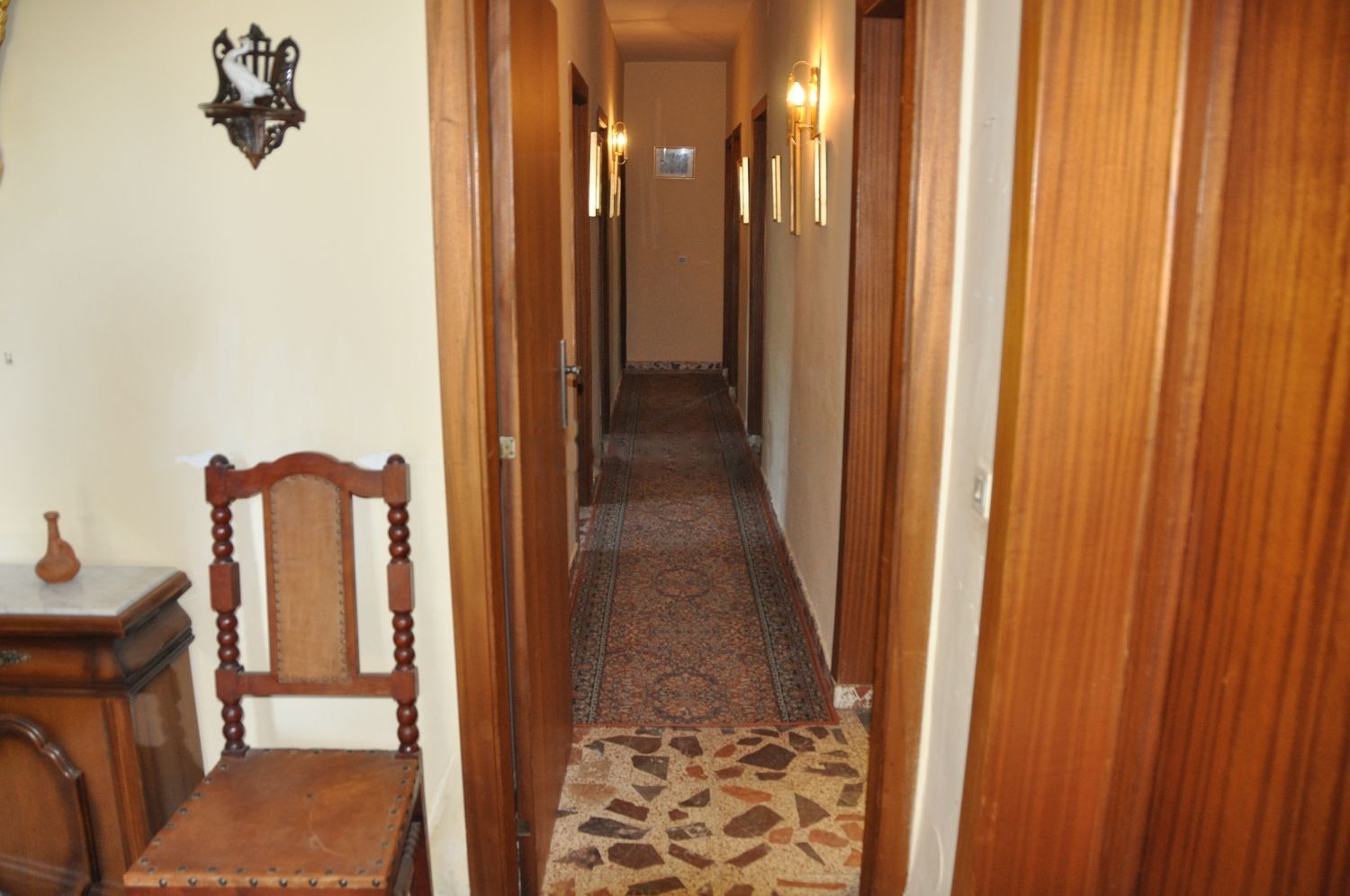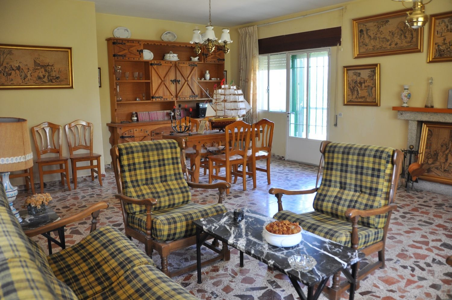 La vivienda, de una sola planta, consta de recibidor, salón de más de 30 metros con chimenea, cocina, aseo, baño completo, cuatro dormitorios y dos terrazas (la del salón y la de la entrada). Y en un anexo, en semisótano accesible desde fuera de la vivienda, de un comedor con chimenea y horno de leña, trastero en la parte posterior y una bodega. Dispone también de una caseta de garaje de 30 metros cuadrados separada de la vivienda. Construcción sólida, del año 1.974.