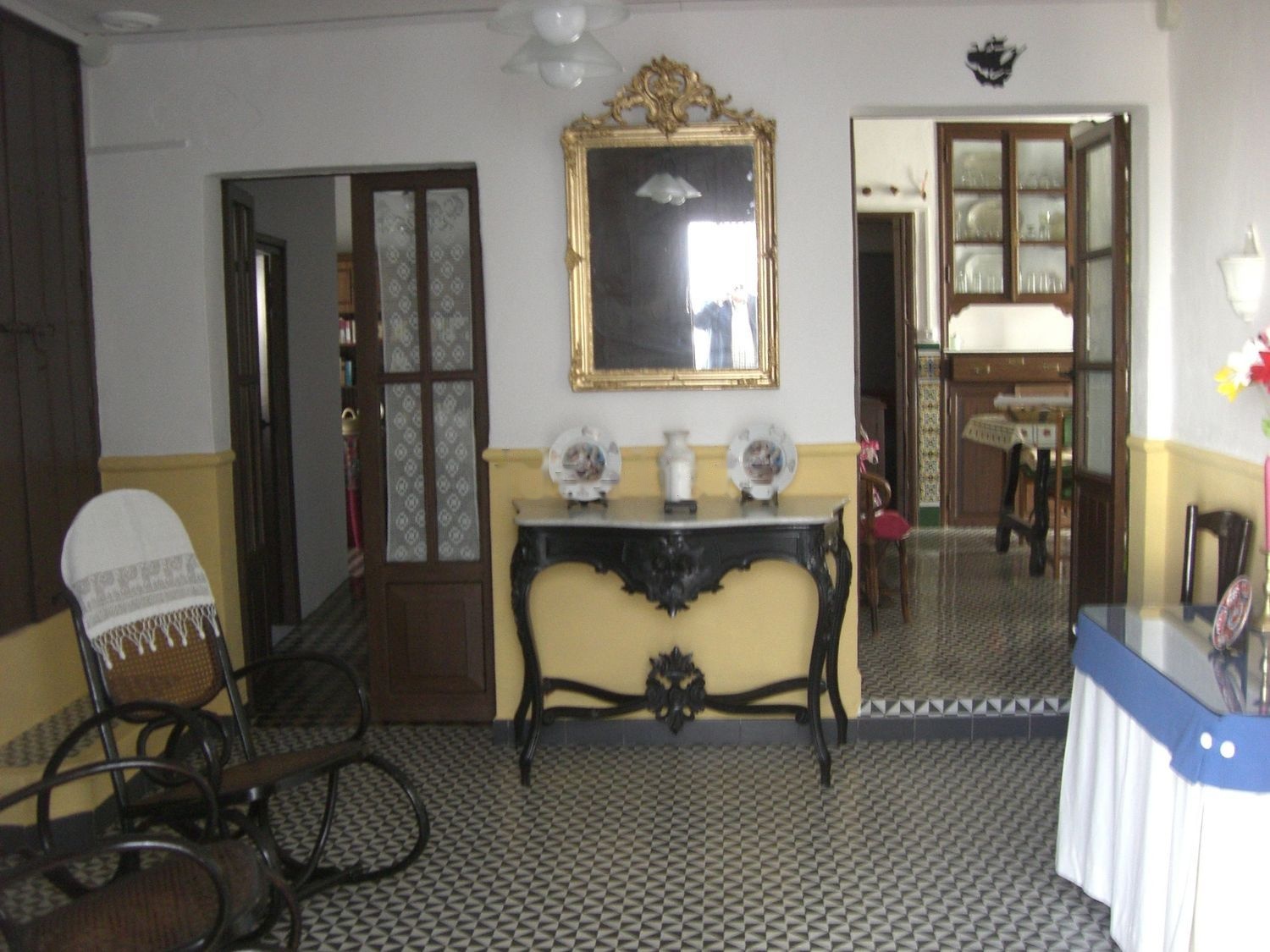 La casa tiene dos patios, uno de ellos cubierto; está reformada en gran parte; cinco dormitorios; dos salas; salón con chimenea de leña; zaguán; dos locales en los bajos rehabilitados de 74 y 46 m2 respectivamente; cocina totalmente equipada; y corral con salida a la calle Maestra Adame. Es una casa muy bonita, en todo el centro del pueblo. En los dormitorios hay calefacción con "calor azul".