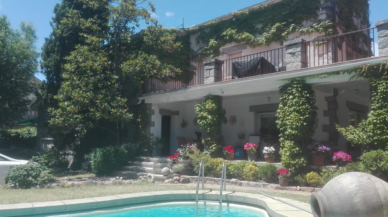 ABSTENERSE Inmobiliarias. Se vende Vivienda Unifamiliar independiente con piscina en parcela de 1000 m2. Se ubica en la carretera de Galapagar a La Navata, con acceso directo desde la misma. La parcela dispone de una zona, orientada al sureste, con zona de césped, piscina y unos preciosos árboles. El jardín trasero dispone de una gran superficie vallada para perros, espacio para un gran huerto, tres casetas (dos de gran tamaño) y un pozo. Una de las casetas está preparada para albergar dos motos y bicicletas. Se dispone así mismo de espacio techado para un coche (o dos pequeños) y espacio descubierto para hasta 4 coches mas.