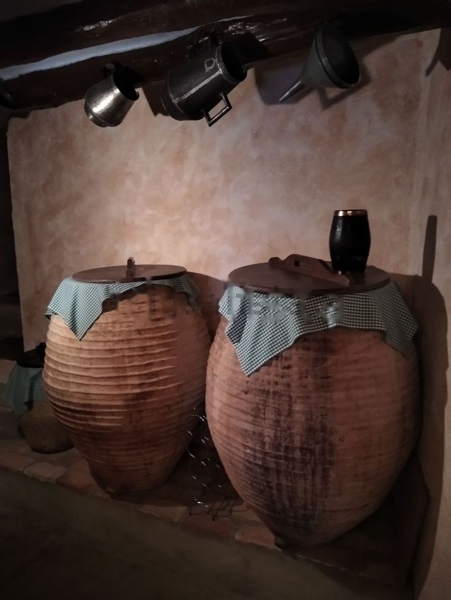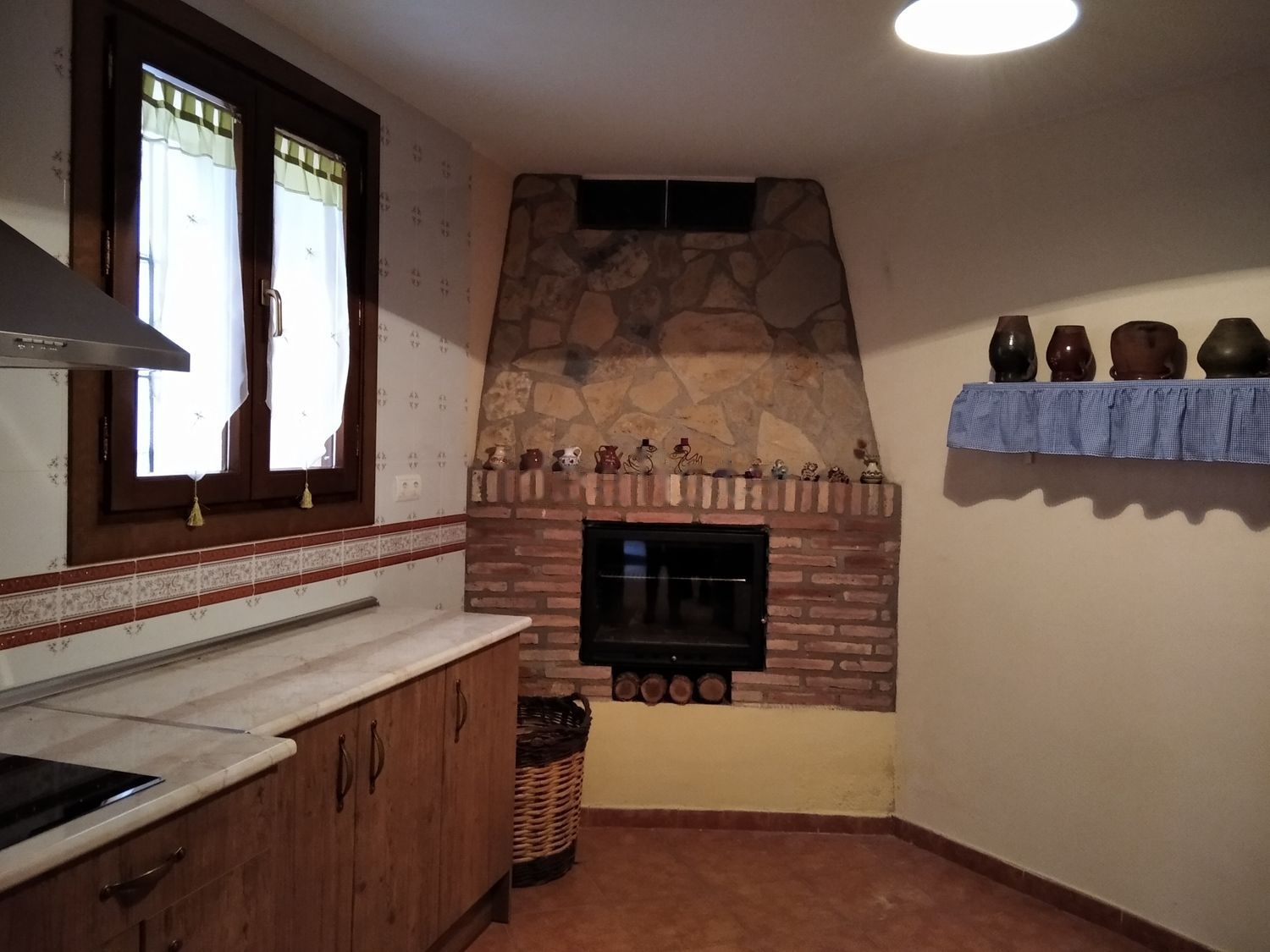 Planta baja: hall de entrada, cocina, baño y bodega con decoración típica.
