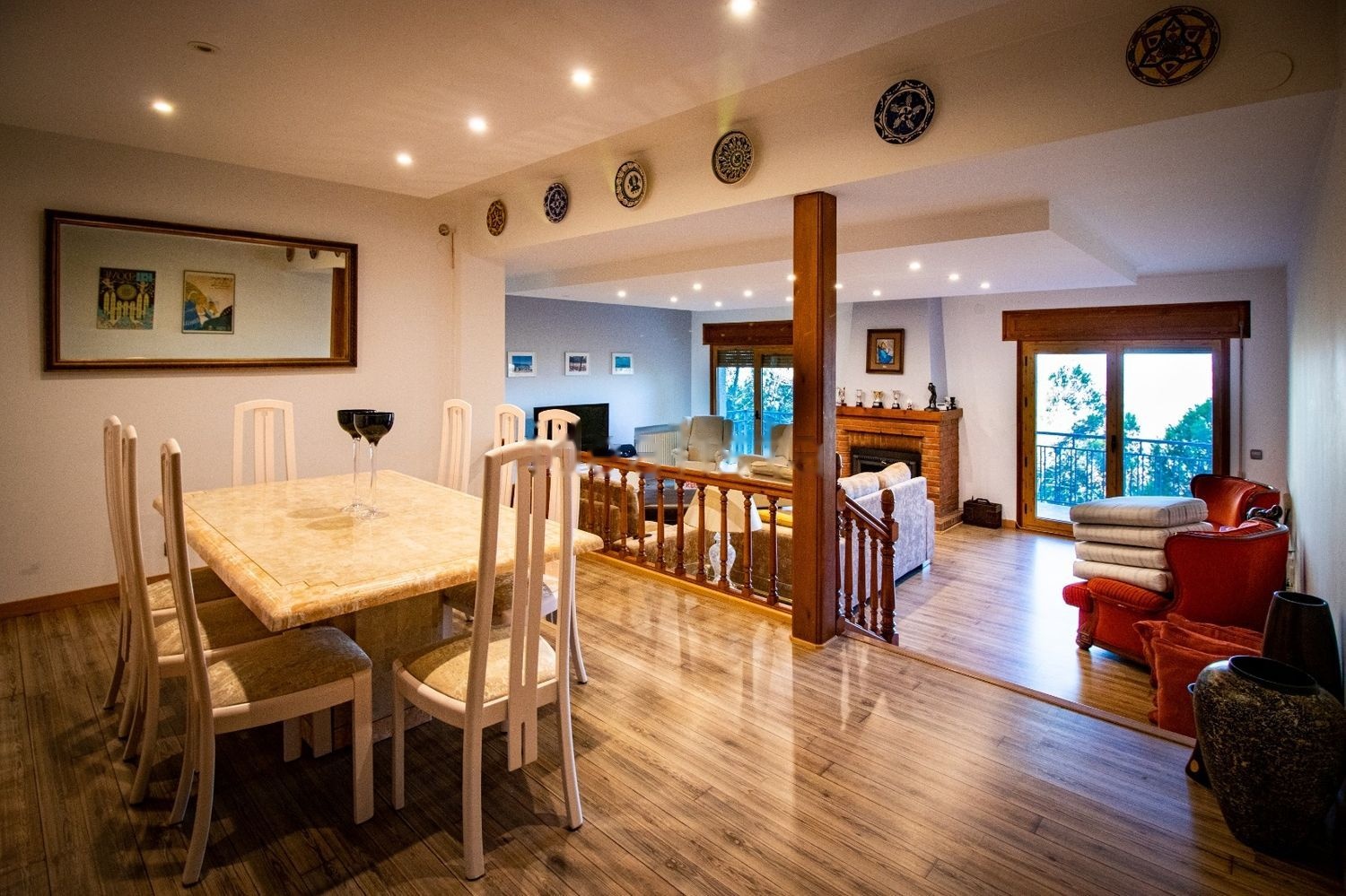 La planta principal consta de 4 dormitorios, 3 baños completos, uno de ellos en suite, salón con chimenea, comedor y cocina con terraza.