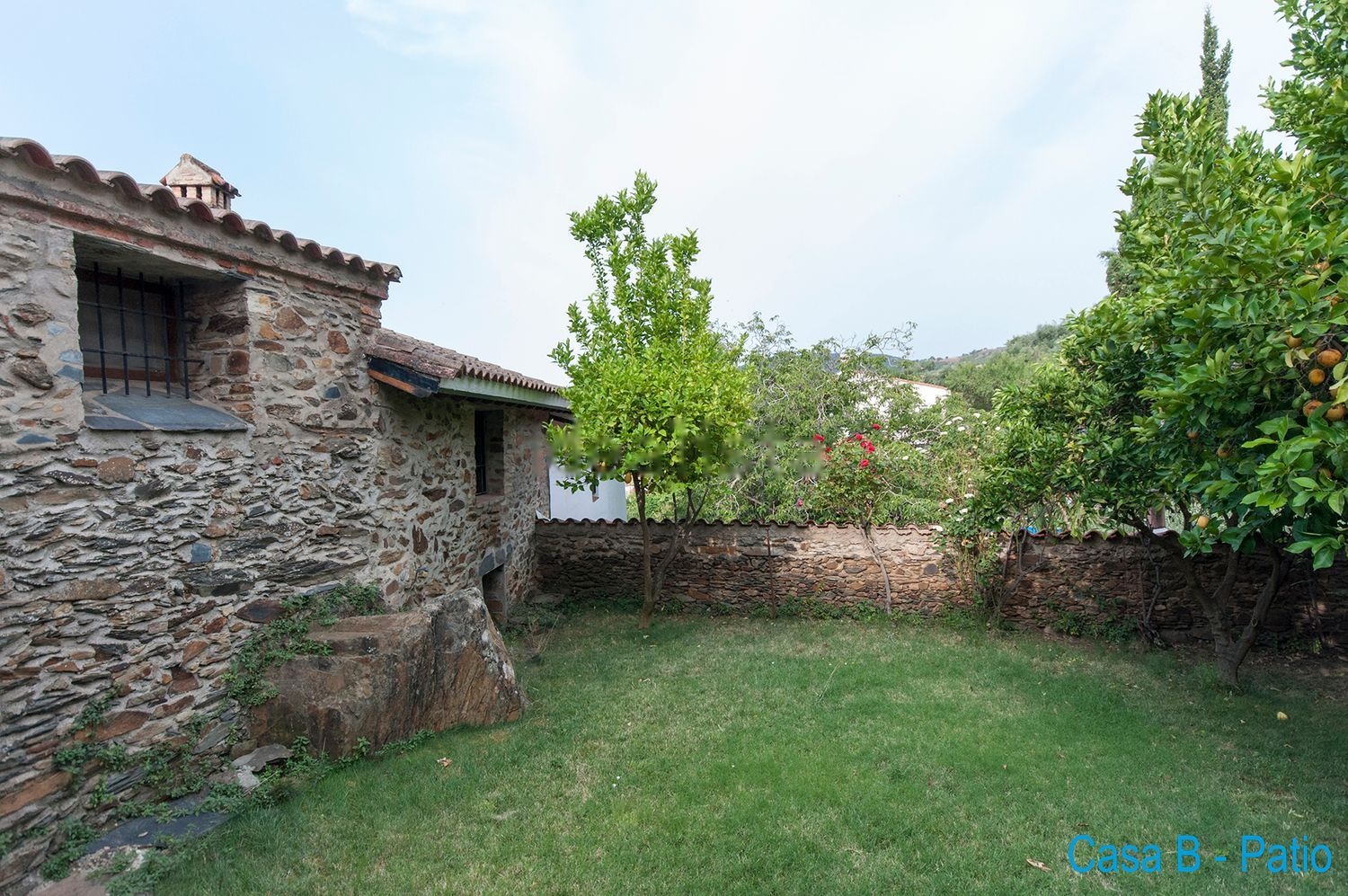 Es un jardín muy grande con vegetación de gran porte. Hay una gran variedad de árboles frutales y arbustos florales que dan frutos de gran calidad todos los años, entre ellos almendros, nogales, limoneros, naranjos, mandarinos, higueras, ciruelos, melocotoneros, caquis y parras.