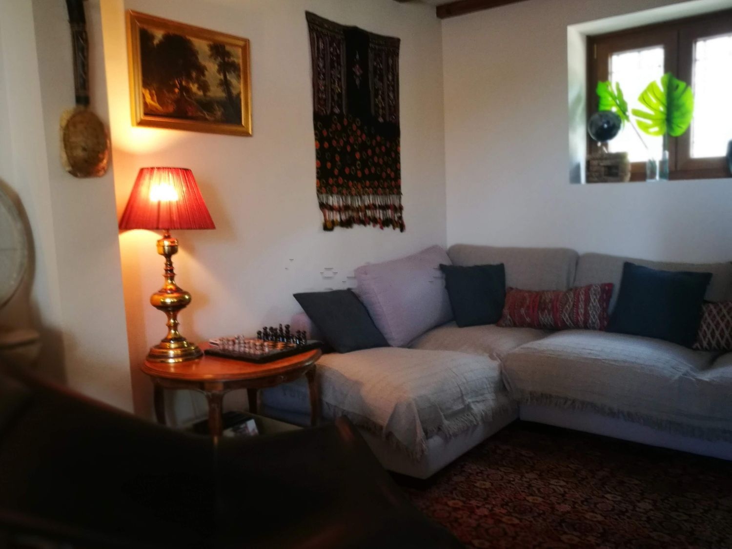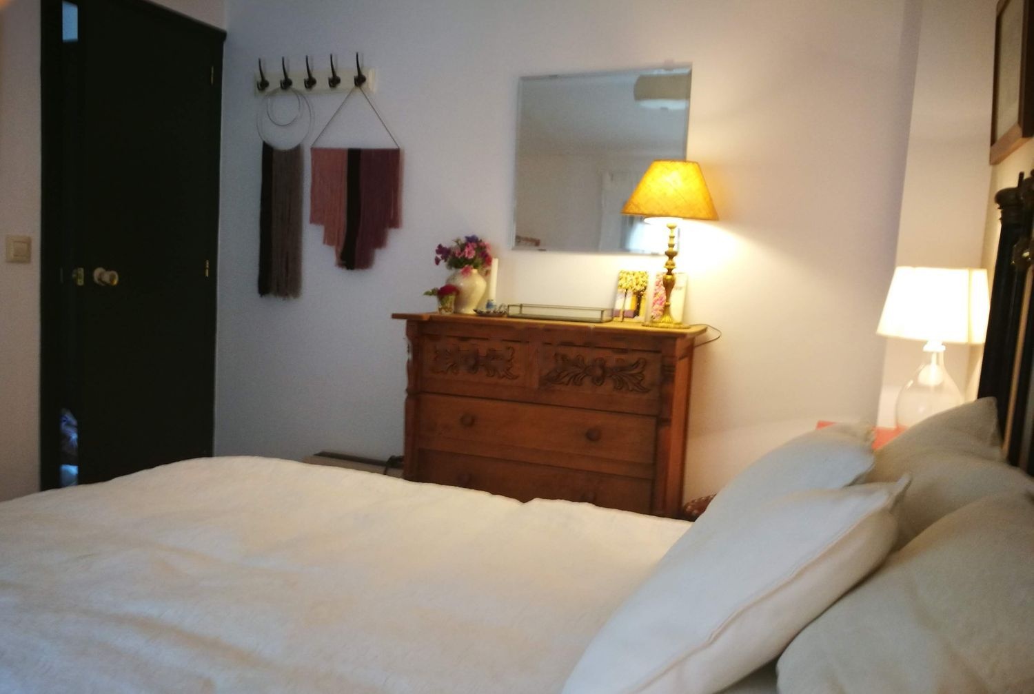 En el primer piso se encuentra la cocina con mesa y amplia bancada donde difrutar de veladas al agradable calor de la estufa de leña aquí situada. En este piso también se encuetra el baño con gran plato de ducha. En el seguno piso se encuentra el bonito salón desde dónde se puede disfrutar de las vistas del pintoresco pueblo blanco con floridos balcones y calles empedradas. El salon cuenta con varias zonas, zona de television con un gran sofa rinconera de Kenay, butacones de lectura junto a la gran chimenea de piedra asÍ como otro sofa de tres plazas junto a la mesa de comedor de madera maciza junto a la gran ventana desde dónde apreciar el amplio horizonte de la sierra. En el tercer piso se encuentran las dos habitaciones, una de ellas con armario empotrado, la otra cuenta con burro exento. Ambas cuentan con comodas de cajones y percheros de pared y camas queen size.