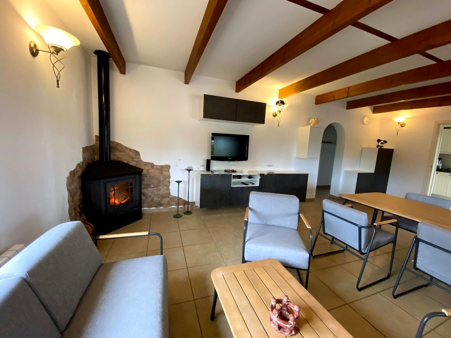 Completamente vallada, puerta principal eléctrica. Suministro de luz y agua más fotovoltaica con baterías. Calefacción de gasoil, chimenea y aire acondicionado, planta baja con dos dormitorios, vestidor, baño con ducha y bañera, baño de invitados, salón y cocina.