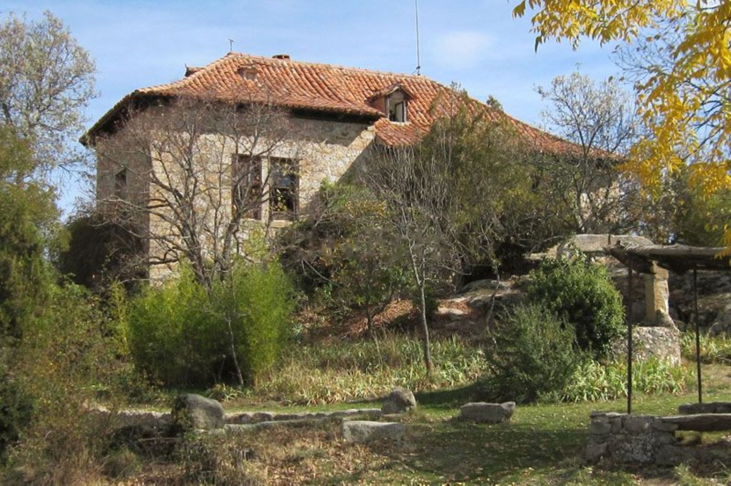 Jardín, según Catastro, de 5135 m proyectado con bancales a diferentes niveles. Árboles autóctonos (roble, encina, fresno, sabina, olmo, pino…) 3 estanques de piedra y pozo con agua para riego. Actualmente uno de los estanques convertido en piscina.