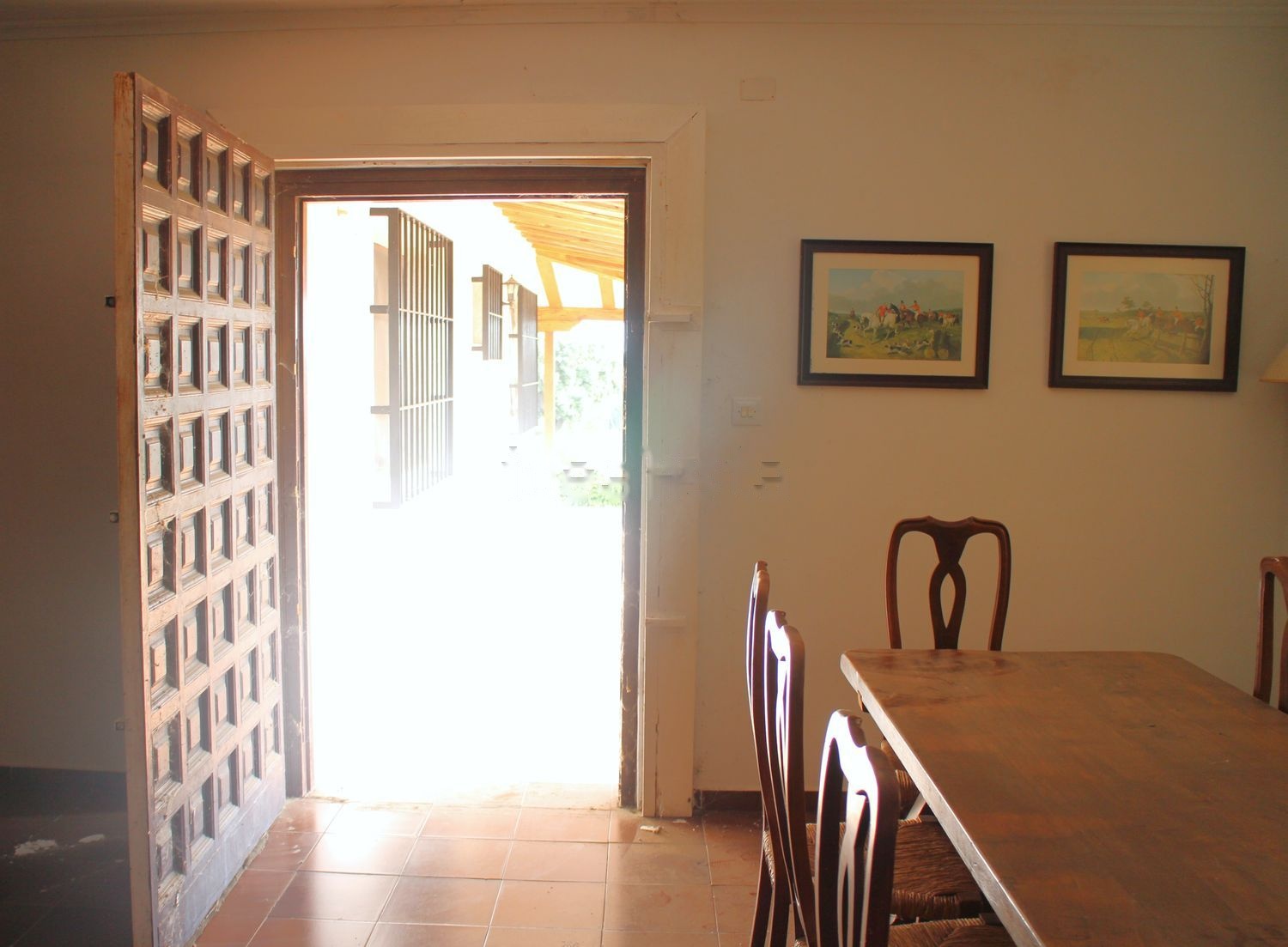 El salón tiene salida a un precioso porche que da acceso a la piscina y desde donde se contemplan unas preciosas vistas de la finca, la sierra de Gredos y el pueblo de Mentrida.