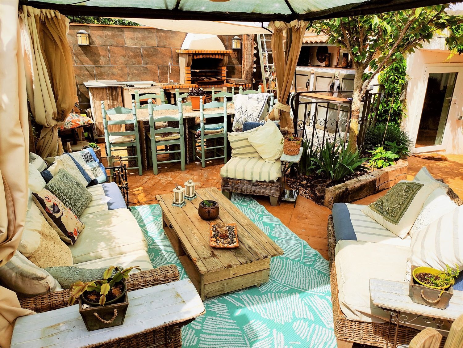 La residencia cuenta con un amplio porche al frente y esta rodeada de un precioso jardín de 500 mt2. El riego se realiza a través de la recuperación de aguas residuales (depuradora de oxidación total) y sistema automático. Cuenta con una piscina (4 X 5 mt) con sistema recirculante. Tiene una amplísima barbacoa con todas las instalaciones para guardar utensilios propios de la actividad.