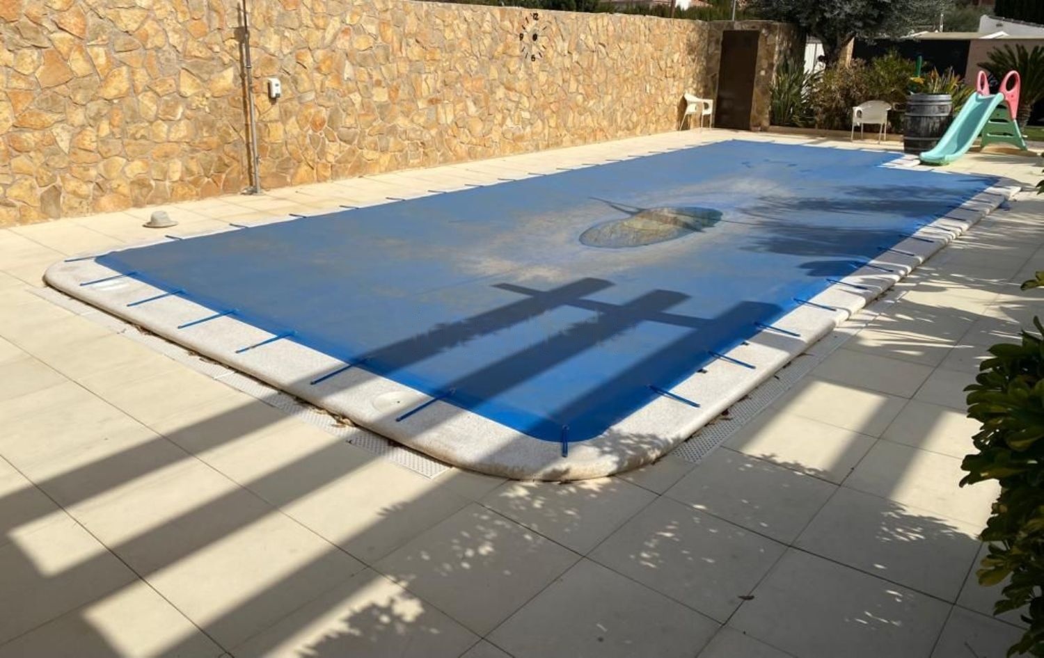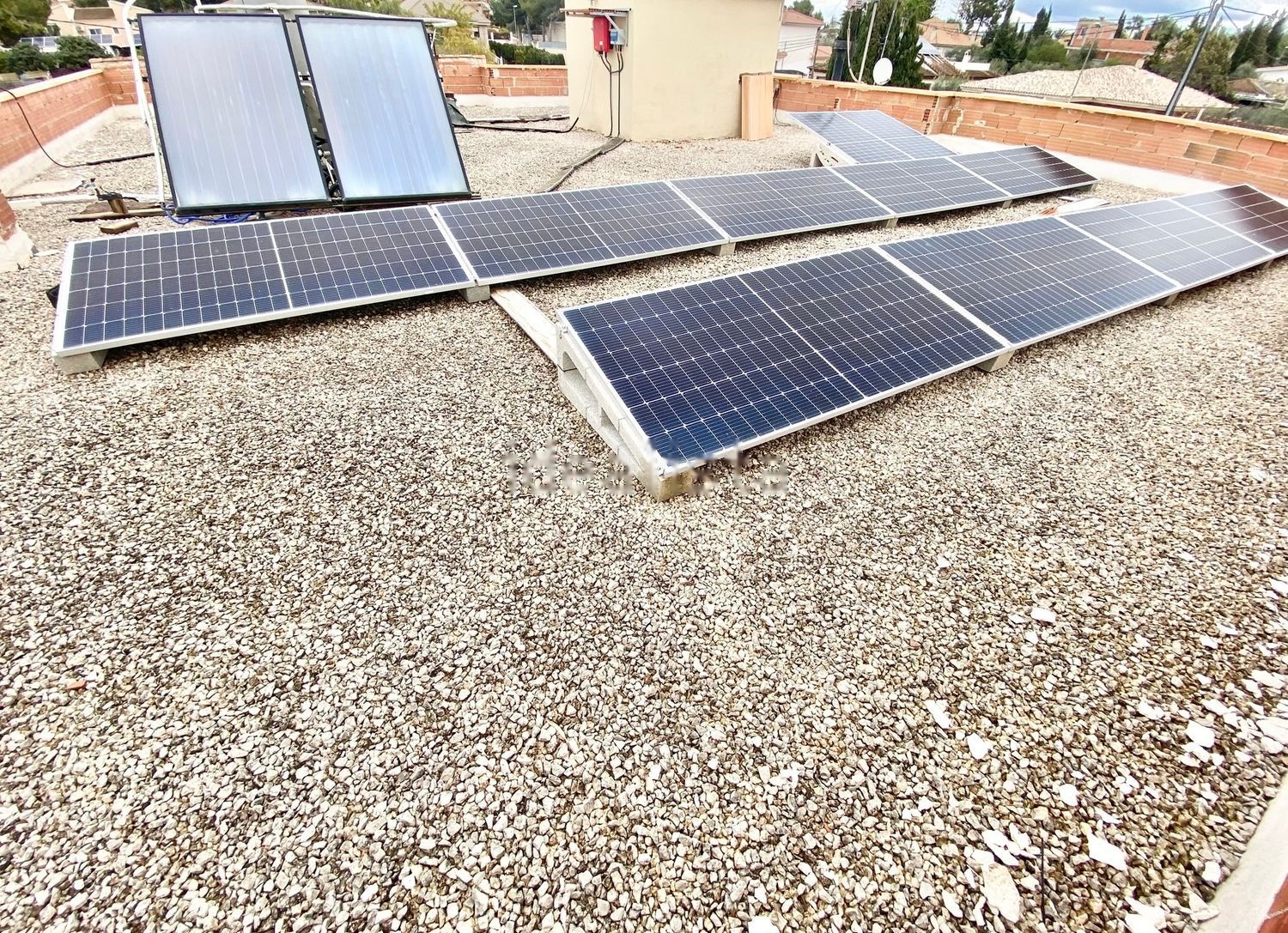 •2 placas térmicas, con depósito de 1000l, para abastecimiento de agua caliente sanitaria (ACS) durante todo el año. Incluyendo instalación para derivar el exceso de ACS del depósito, a la piscina mediante manguera. En términos de ahorro, el calentador de gas permanece desconectado desde mayo hasta octubre.