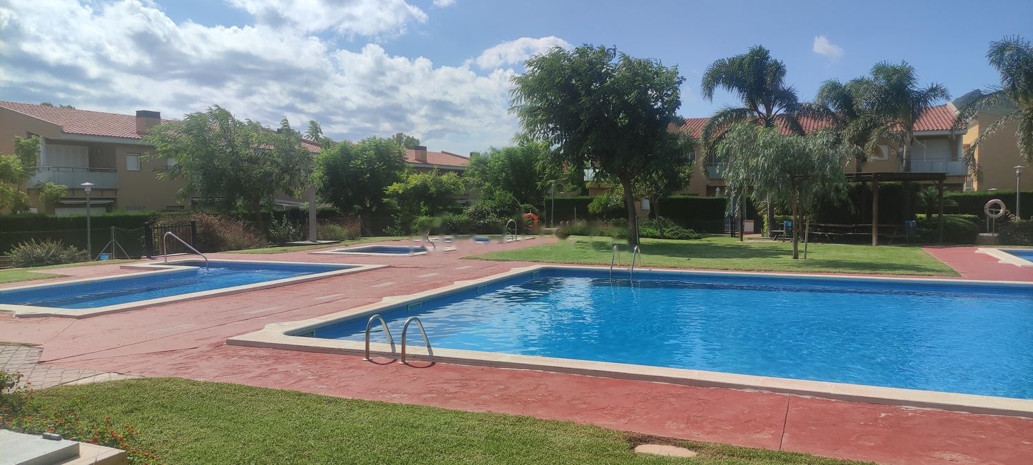 De particular a particular. Adosado con inmejorable zona comunitaria en la Urbanización Casalot de Miami Platja. Acceso principal con zona de parking y terraza. Planta baja con comedor con salida a terraza privada, cocina americana, una habitación y un aseo. Planta primera con 2 habitaciones, baño completo y 2 grandes terrazas orientadas a mar y montaña. Espacio extra con zona de almacenaje y polivalente de 35m2. Acceso directo a gran zona comunitaria ajardinada con 3 piscinas, una de ellas infantil, y 2 jacuzzis y zona de parque infantil.