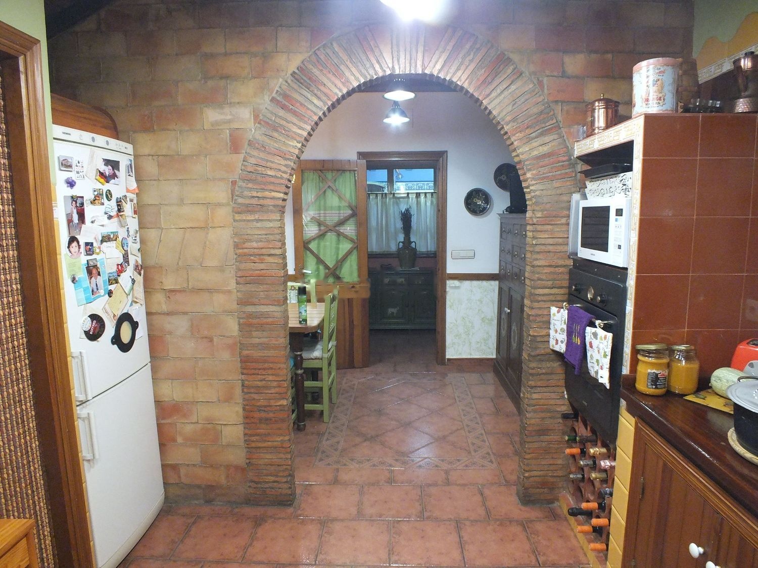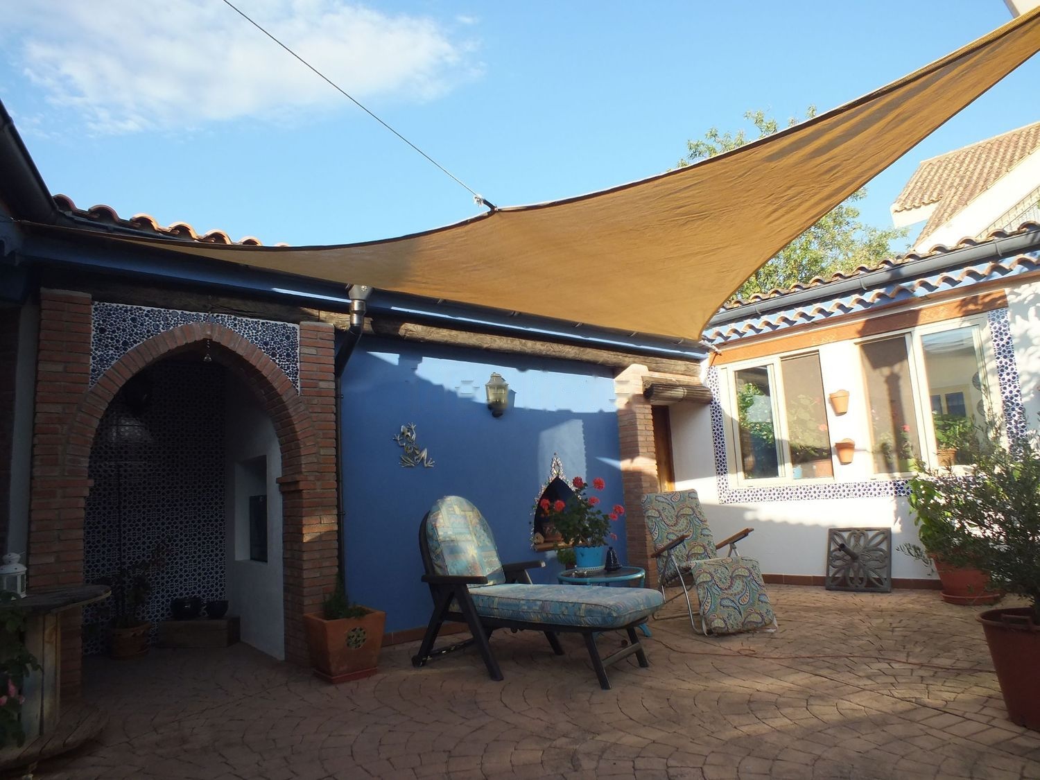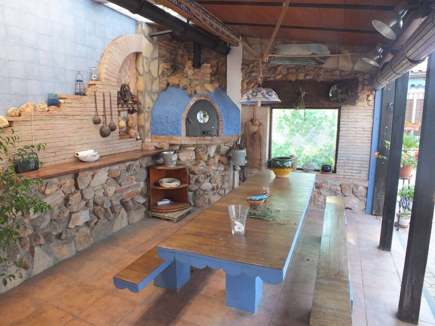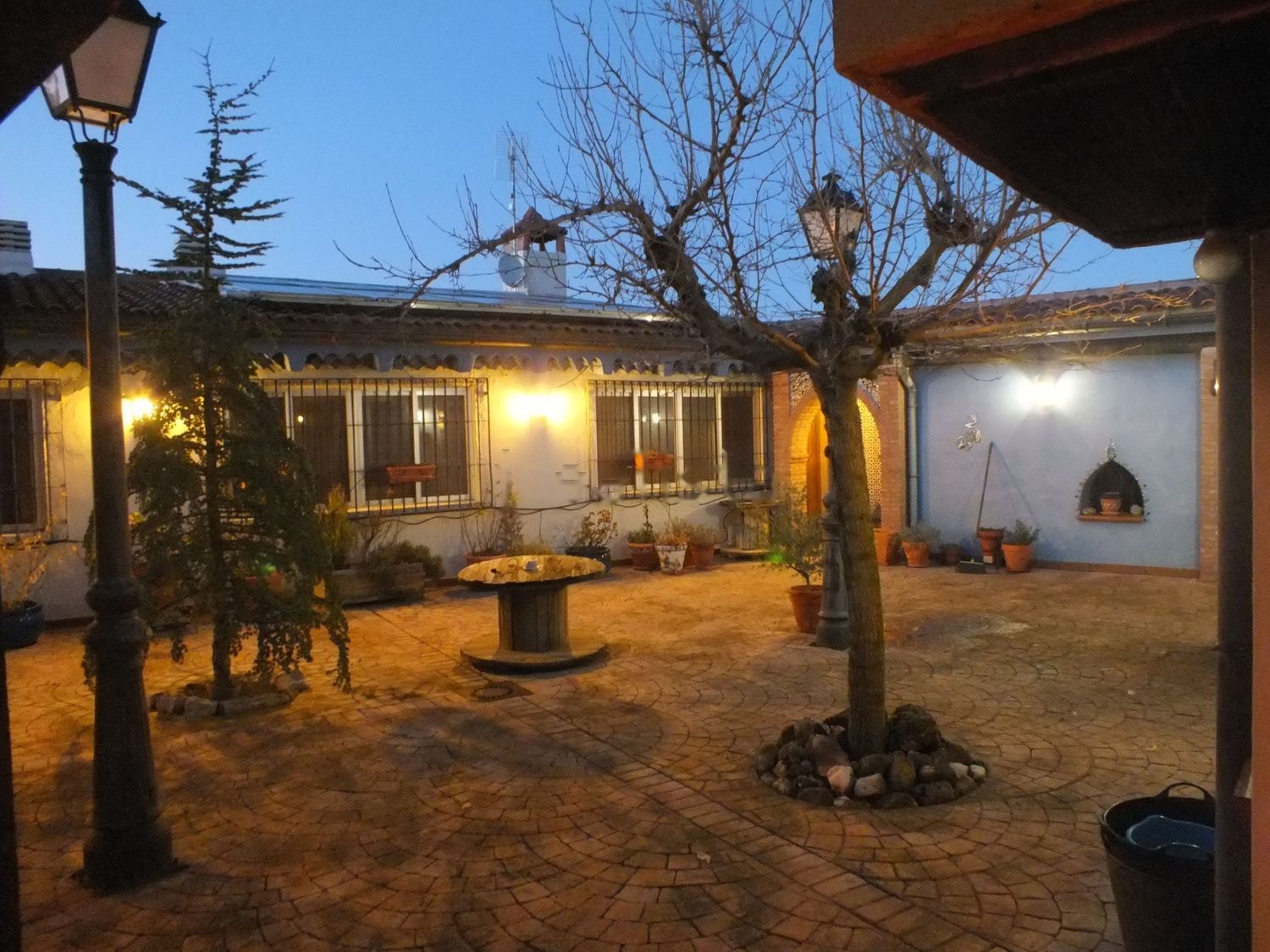 La zona de patio tiene mas de 200 metros encontrandose entre ambas casas y con acceso la piscina cubierta donde se encuentran ademas porche cubierto con mesa y bancos fijos de madera para 12 personas disponiendo de horno moruno, horno de hierro y barbacoa. Desde este patio se accede igualmente a sotano-bodega.