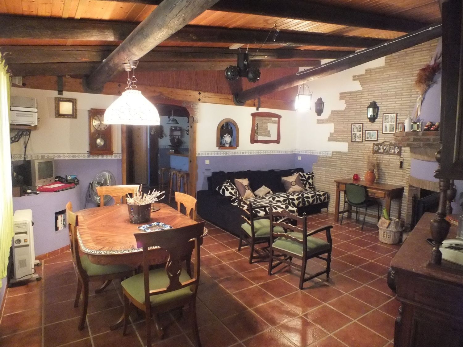 La casa pequeña construida en estilo rustico con utilizacion de vigas y techo de madera asi como algunas de sus paredes paredes forradas de piedra, dispone de cocina comedor, sala con chimenea de leña, dos habitaciones y baño completo.