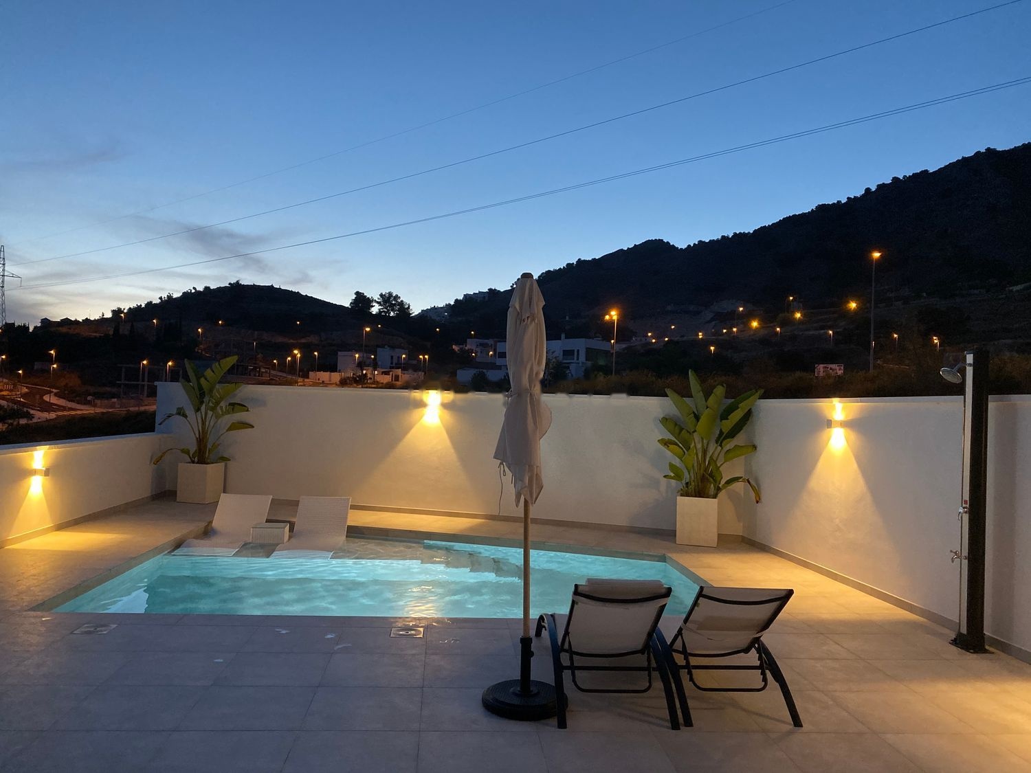 La piscina privada con zona de playa para las tumbonas crea la atmósfera ideal para relajarte y disfrutar del clima soleado de la Costa del Sol.
