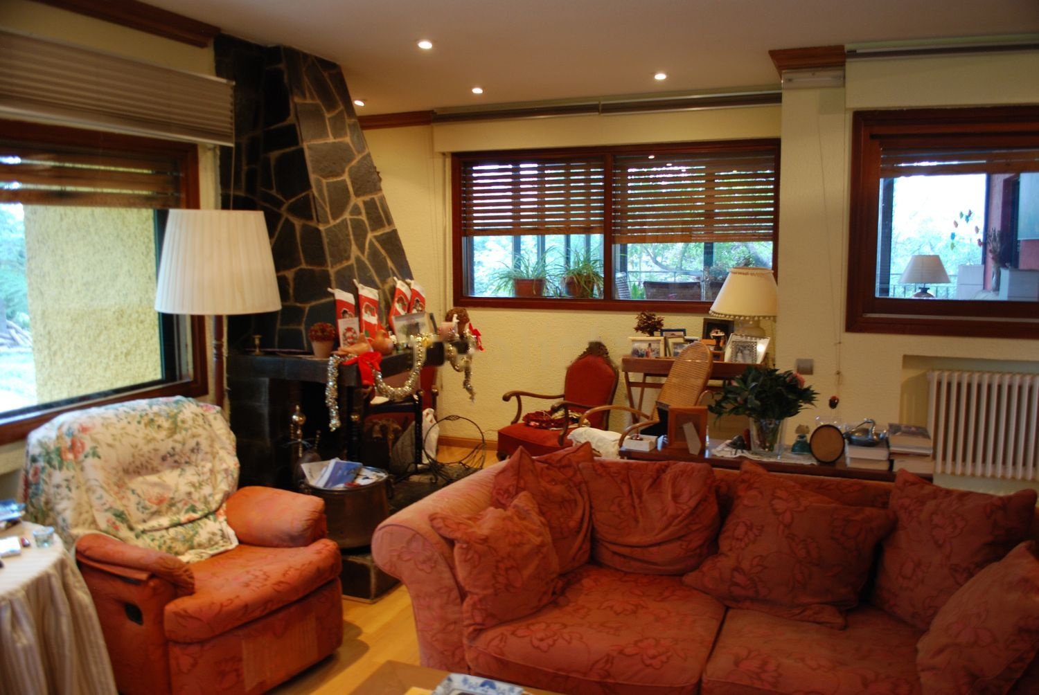 -Amplio Salón de 45,66 m2 en dos alturas con barandilla de madera maciza de pino Oregon, suelos de tarima flotante de Roble Americano. Chimenea y armario tras esta que contiene una pequeño bodega de vinos.