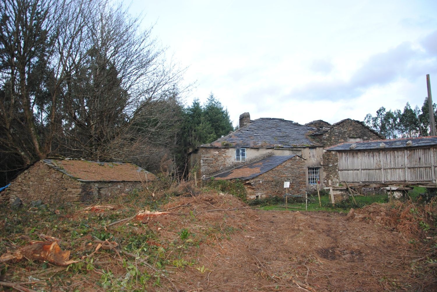 Two beautiful large farms with 1,5ha of attached land. The houses are built against each other with an official joint built area of 750 m2. They both are registered, so both have a house number. We have had electricity connected. And a drainage of two meters deep has been constructed. These drainages are necessary for the high groundwater and rainfall in these parts of Spain. A small part has been largely renovated, walls restored, new chestnut wooden roof with natural slates, floor, stove... There are three stone ovens, two of which are intact. One part of it is ruined, but most of it still has a good wall structure. It needs complete renovation, this will take some effort. But the complete building is so huge, there is a lot of material to recuperate. The small house on the north part is a good starting point because its almost ready to live in, we did. It needs some plastering and other details.