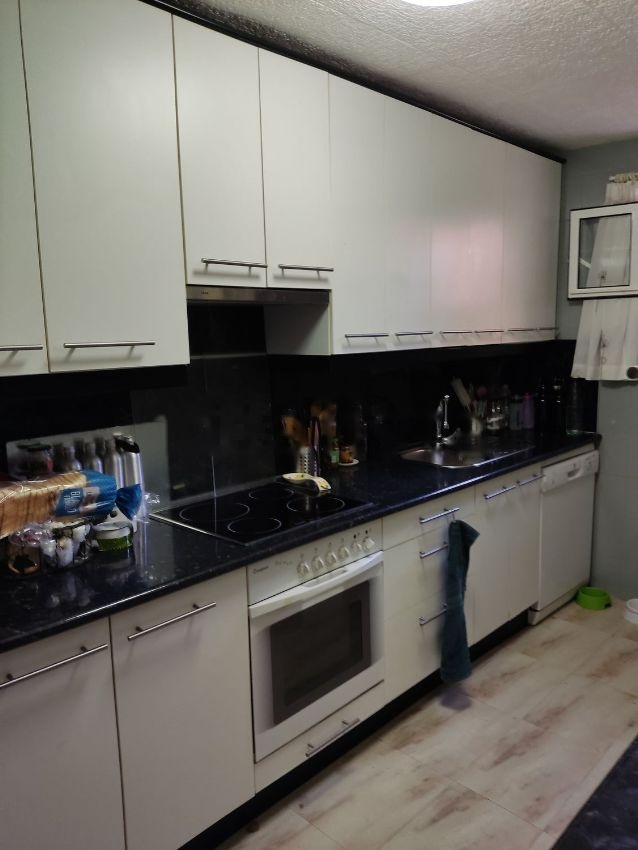 La cocina está toda amueblada con todos los electrodomésticos.
