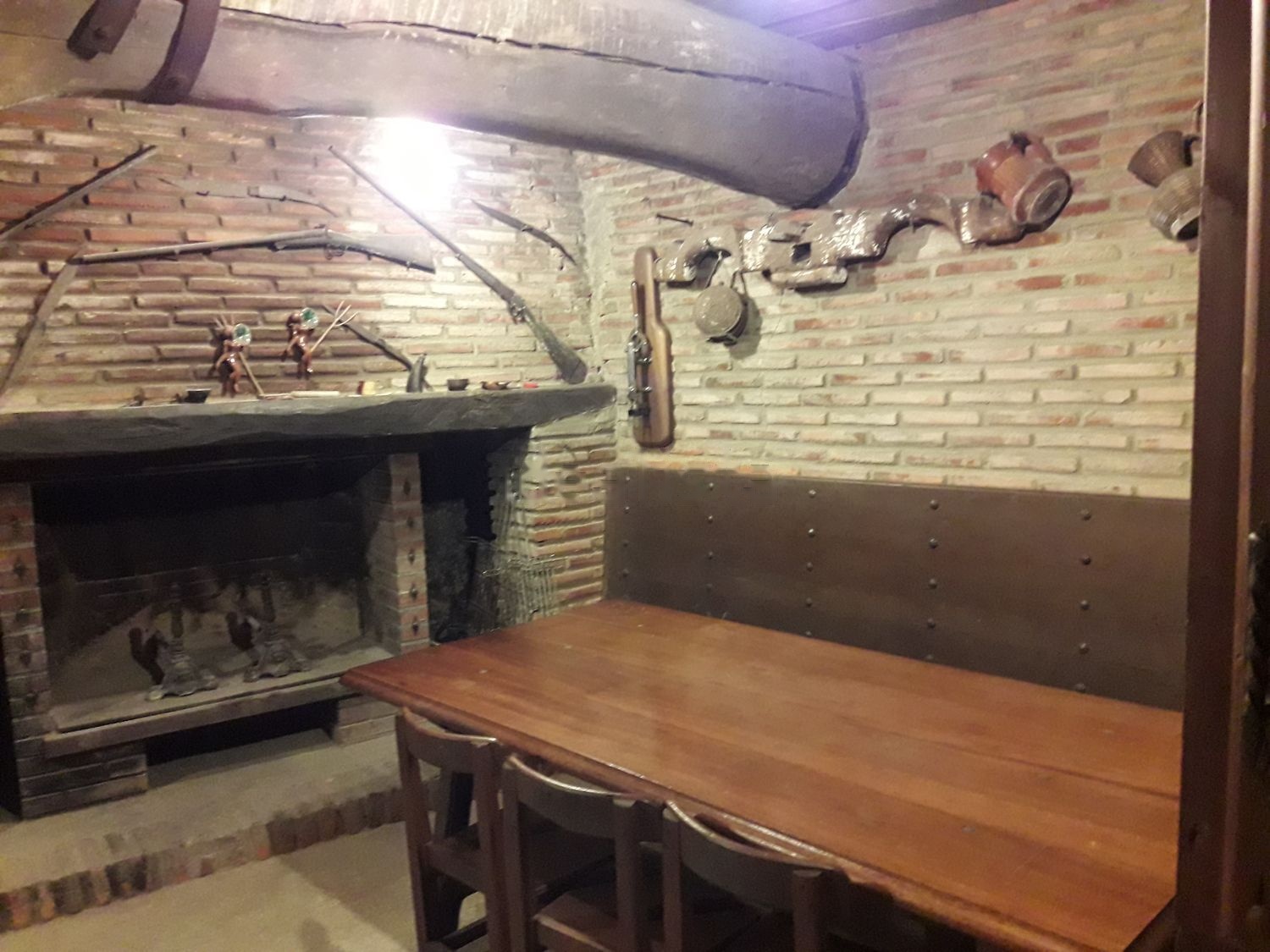 Tiene un espacio cerrado con una chimenea mesa larga, bancos y alacenas.