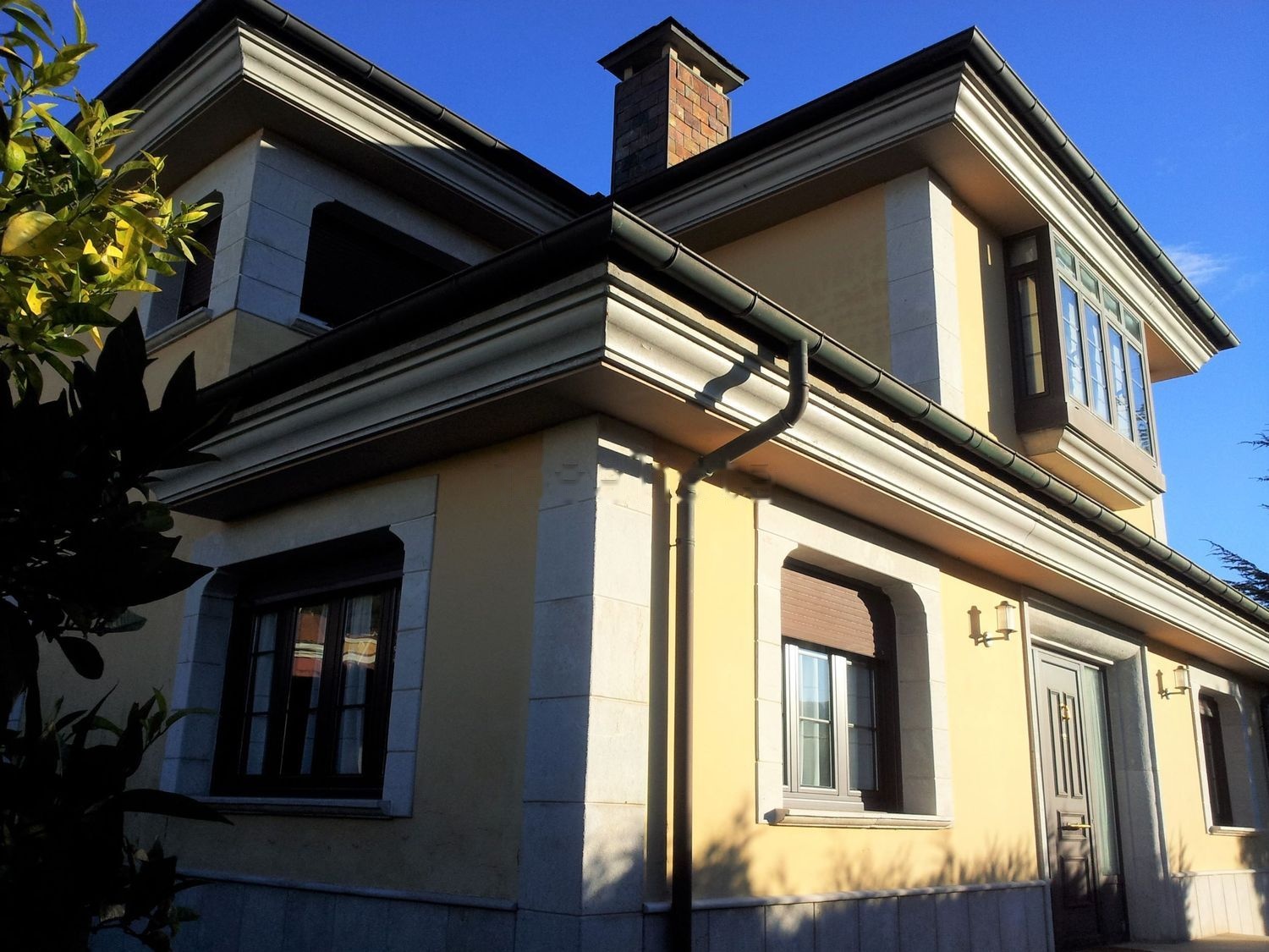 - Tejado de pizarra natural, gallega, de color cobrizo, rematada con perfilería de cobre al igual que canalones y bajantes.