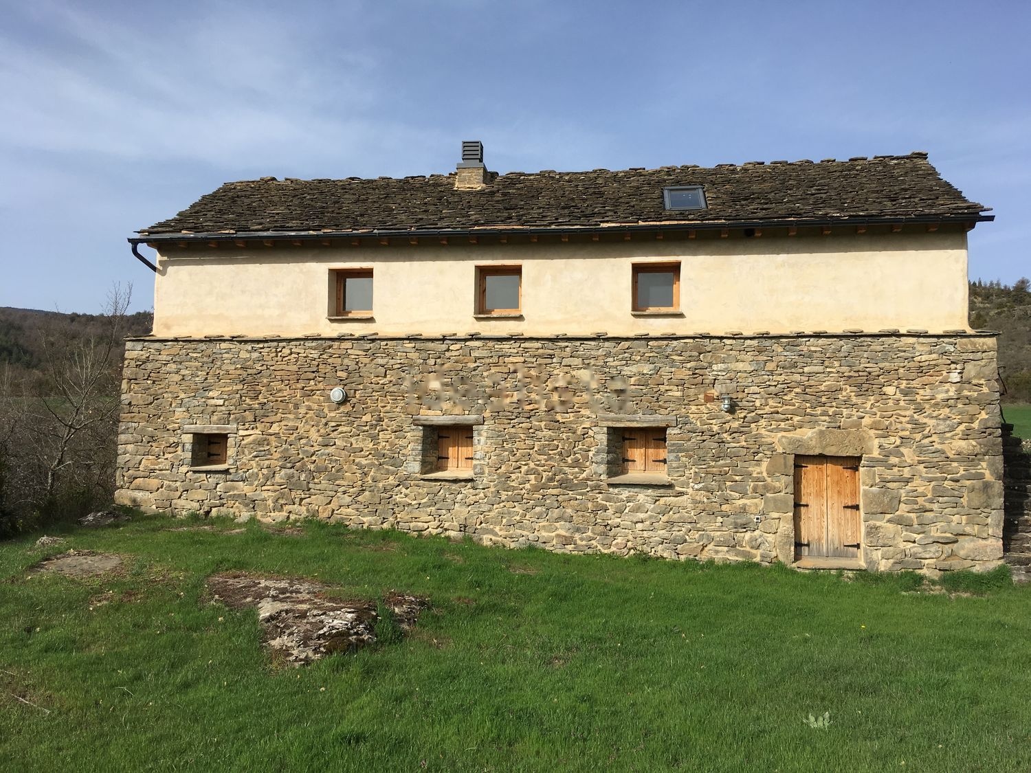 Preciosa vivienda unifamiliar Bioconstrucción en el pre pirineo oscense de 208 m2 construidos, planta baja de 98 m2, planta bajo cubierta 95 m2, trastero de 10 m2, porche de 5 m2 y patio interior terraza de 50m2, linda en al fachada este con una era de 460m2 y con la fachada sur-oeste con terreno de 950 m2 que linda con arroyo barranco. Totalmente legalizada y muy bien aislada, con agua corriente, luz y caldera individual de pellet.