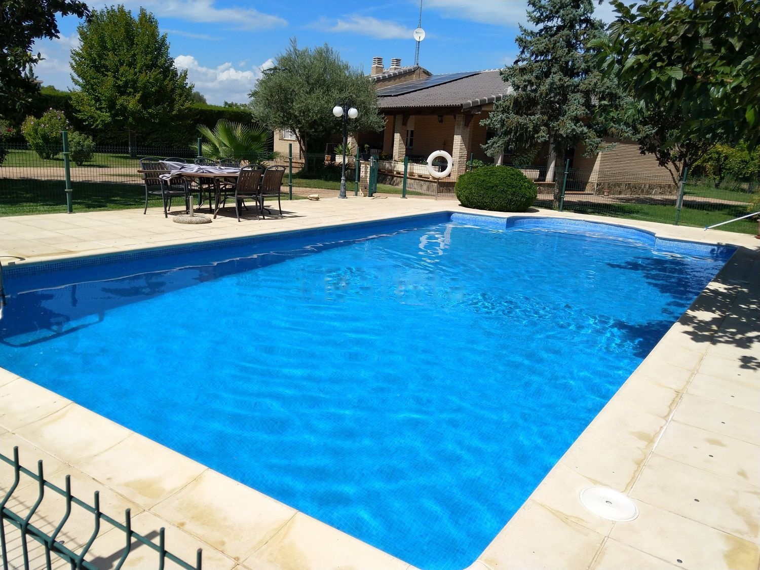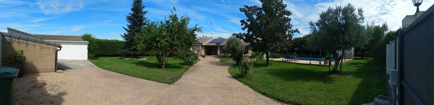 Dispone también de una gran piscina de 100.000 litros, totalmente vallada y con caseta de depuración. La zona verde está compuesta por unos 200m de césped en la parte delantera de la vivienda y unos 1200 con 20 moreras, que en verano bajan la temperatura exterior hasta 10 grados. Está situado a 10 minutos del centro del pueblo y a 5 de la parada de autobús a Zaragoza.