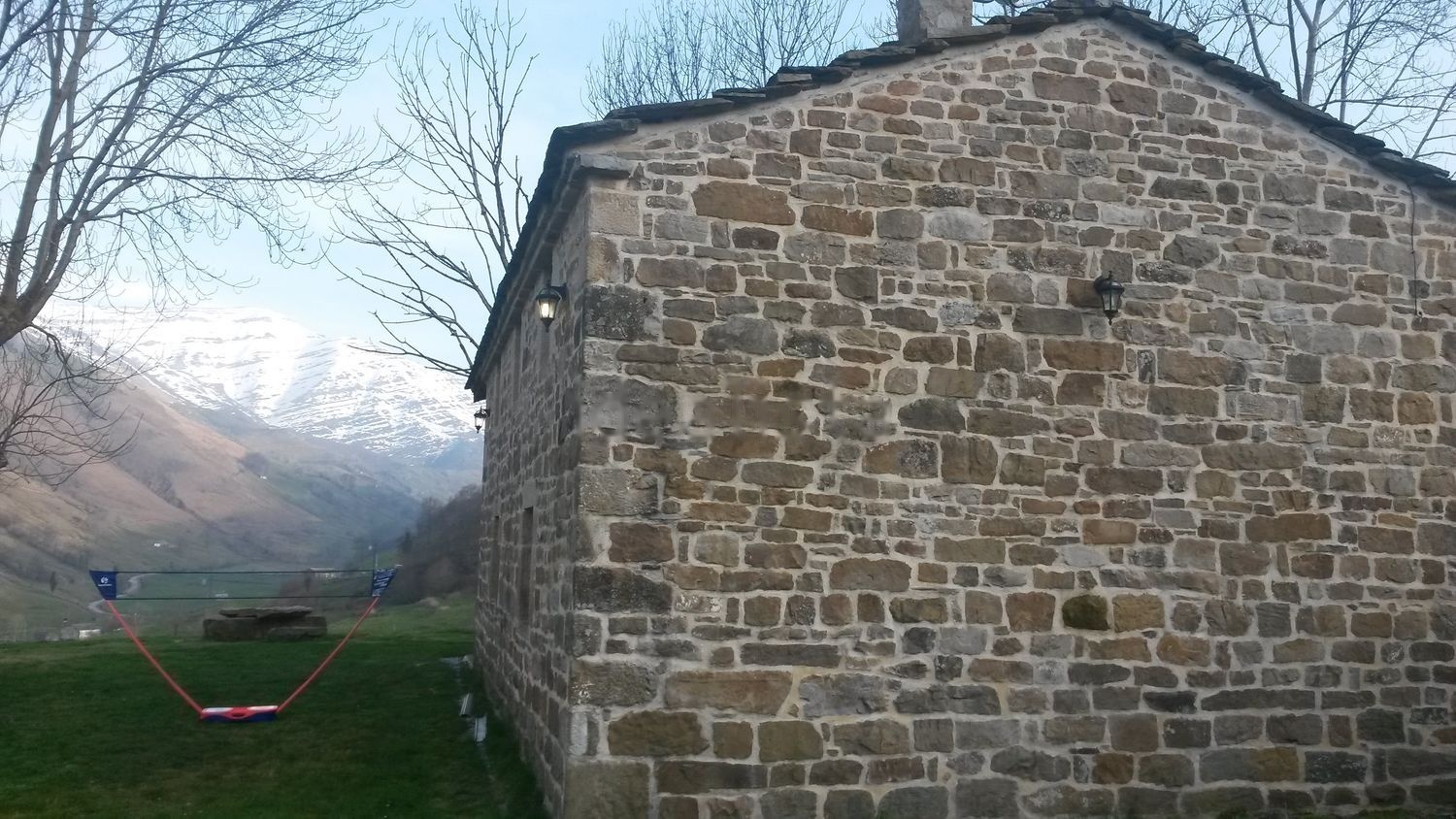 La cabaña es de piedra y madera con el tejado de lascas de granito, el interior tiene dos pisos. La planta baja es diáfana y contiene la cocina, salón comedor y un baño con ducha. En la primera planta hay cuatro dormitorios y un baño completo.