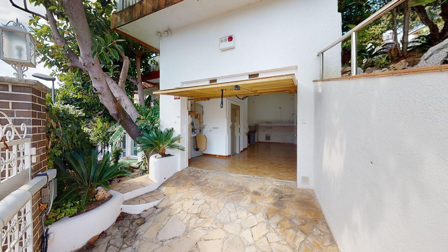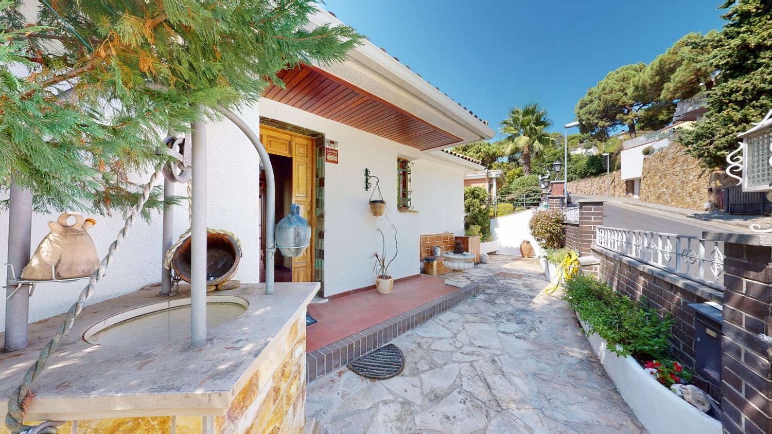 A través de puertas de buen gusto se entra en el barrio, adornado por muros de protección. La propiedad se extiende sobre los tres niveles: Se entra tanto por arriba como por abajo a ras de suelo.