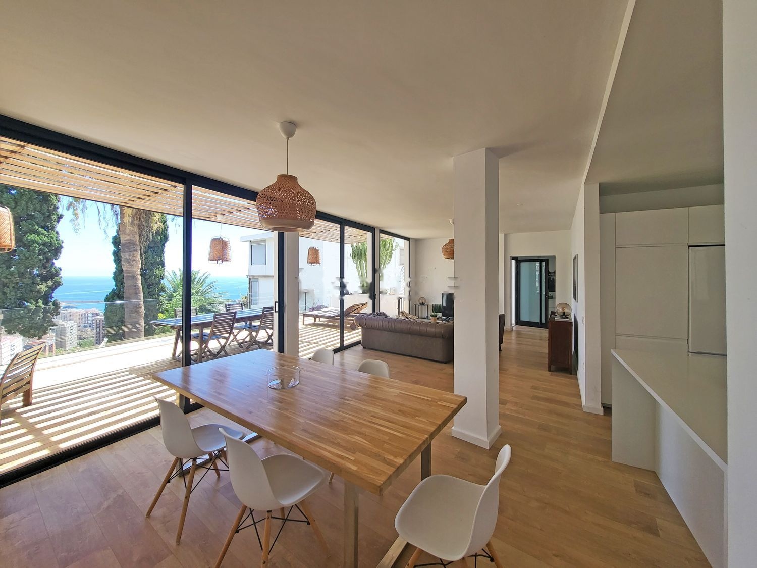 En la planta baja se encuentra el salón-comedor-cocina totalmente diáfano y comunicado directamente con la terraza delantera por medio de ventanales donde se puede apreciar una vista espectacular al mar y la ciudad. En este mismo nivel se encuentra un aseo, una habitación para el servicio y la zona de lavandería. En la terraza se puede instalar una piscina.