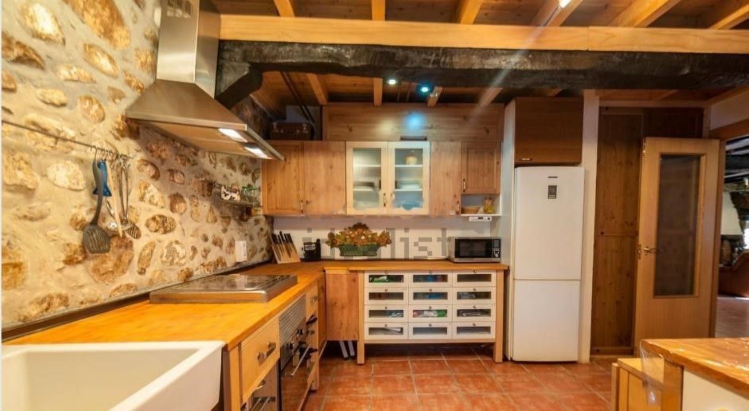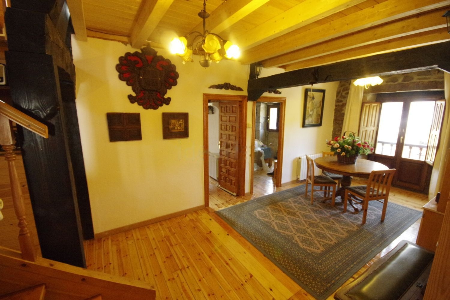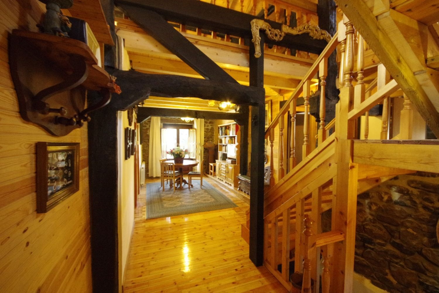 En planta baja tiene un salón de unos 80m2, una amplia cocina independiente, una habitacion con salida al patio y un baño completo. En primera planta un amplio hall-sala y una suite con baño completo con bañera, armario empotrado y salida al balcón cubierto de madera de 13mts de largo. Otra suite con baño completo y otras dos habitaciones con camas de matrimonio con salida al balcón y otra habitación con dos camas. Tiene un tercer baño completo con bañera. Arriba hay una gran bajocubierta con una preciosa vista de las vigas con tres grandes velux de 140x120cms con bonito paisaje y entrada de luz cenital a toda la casa.
