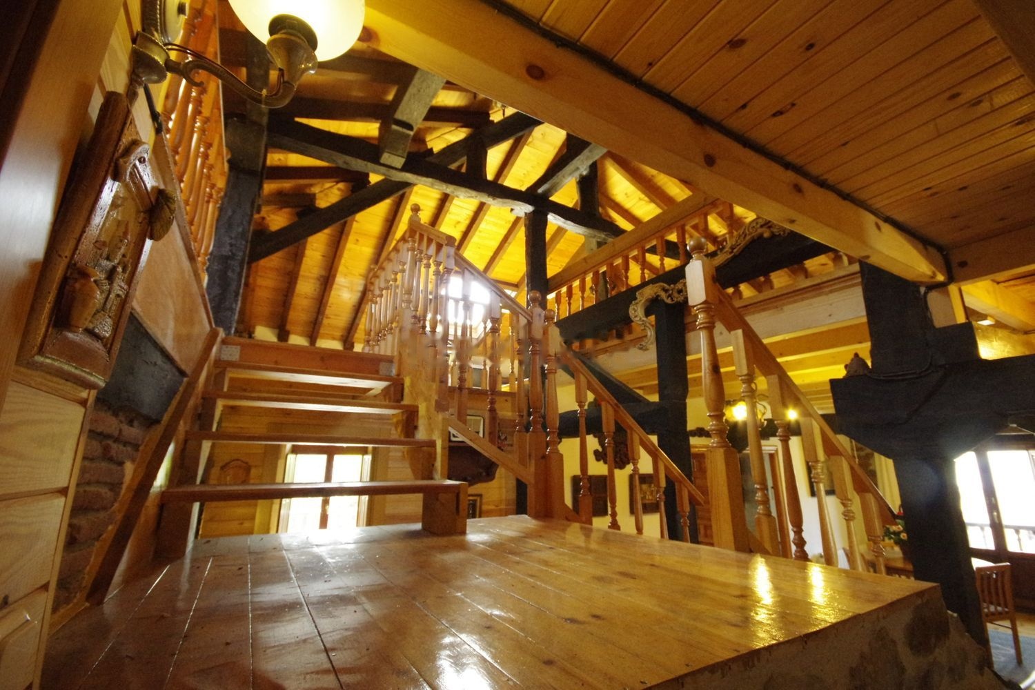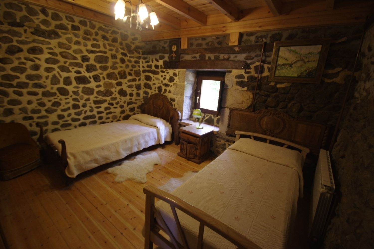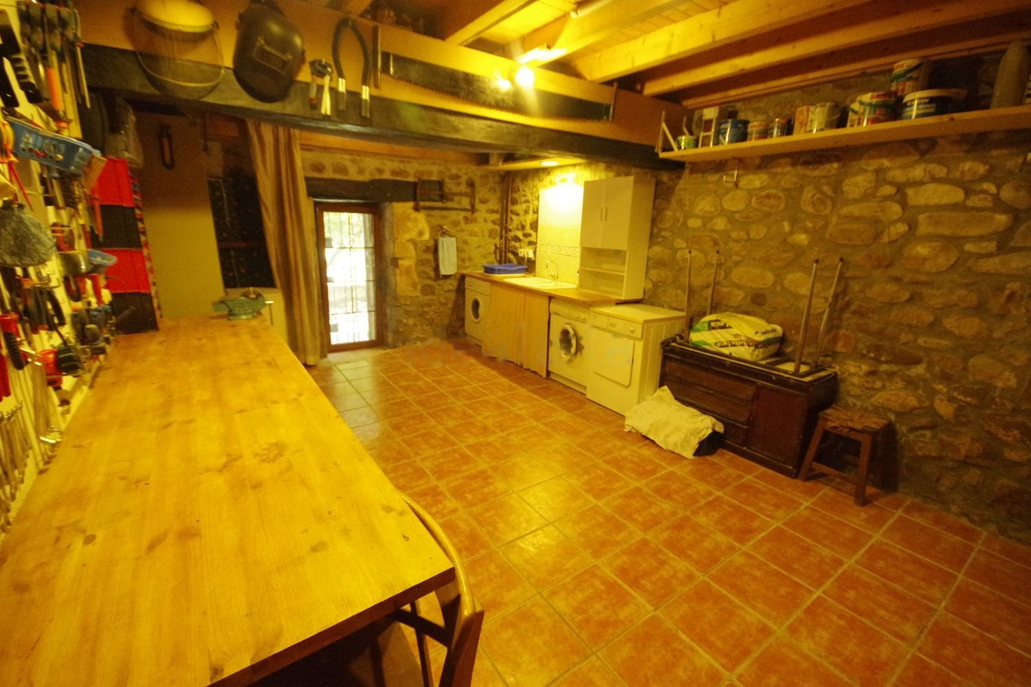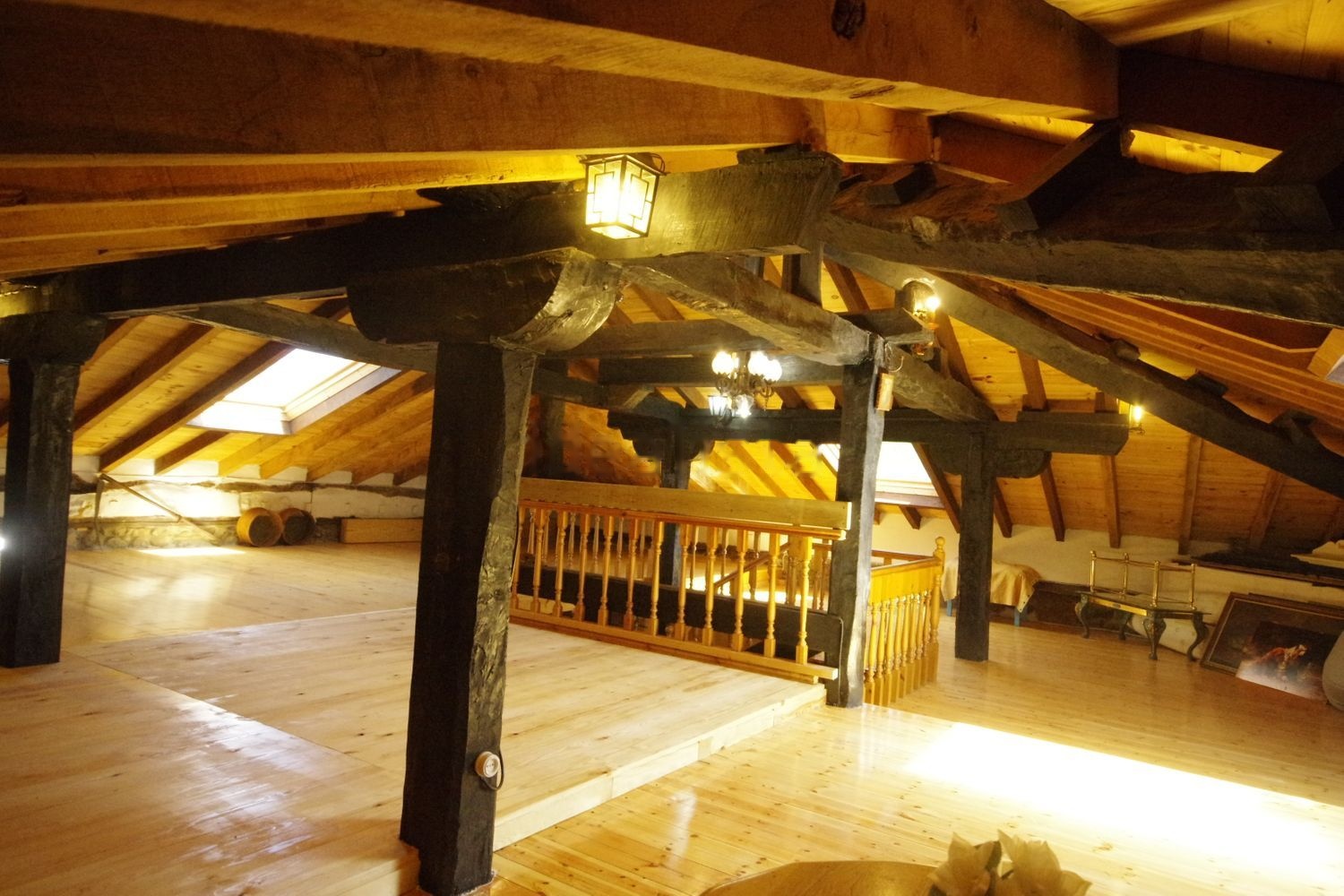 En planta baja tiene un salón de unos 80m2, una amplia cocina independiente, una habitacion con salida al patio y un baño completo. En primera planta un amplio hall-sala y una suite con baño completo con bañera, armario empotrado y salida al balcón cubierto de madera de 13mts de largo. Otra suite con baño completo y otras dos habitaciones con camas de matrimonio con salida al balcón y otra habitación con dos camas. Tiene un tercer baño completo con bañera. Arriba hay una gran bajocubierta con una preciosa vista de las vigas con tres grandes velux de 140x120cms con bonito paisaje y entrada de luz cenital a toda la casa.