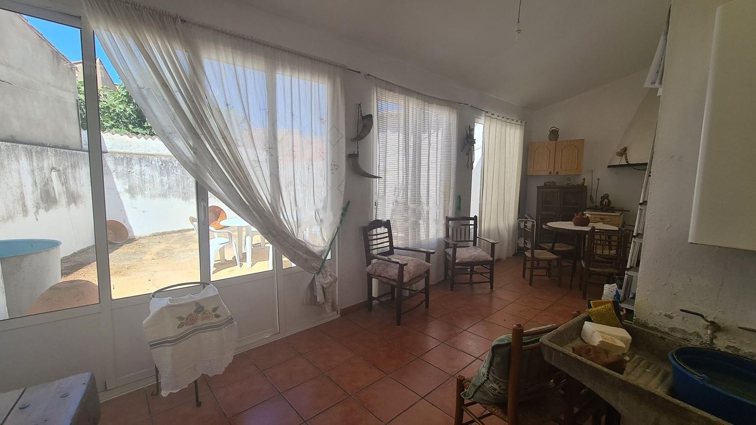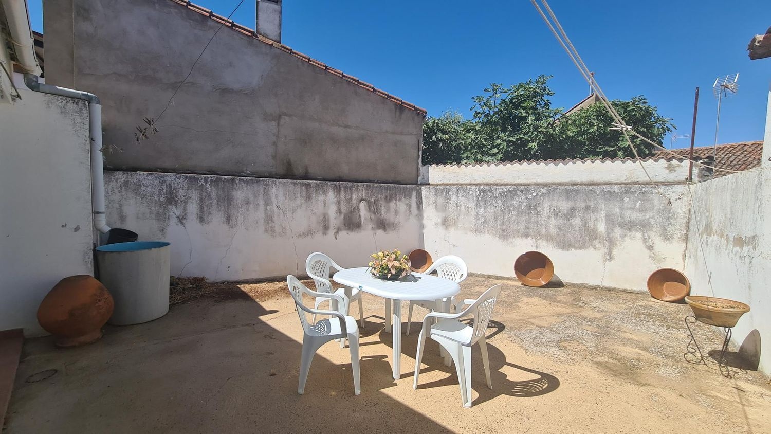 La planta baja consta de 3 dormitorios, 2 salas de estar, un salon/comedor, una cocina con despensa, patio cerrado con puertas de aluminio acristaladas en el cual hay otra cocina y zona de lavanderia. La vivienda posee otro patio exterior de aproximadamente 25 m2. El baño se encuentra en la planta baja.